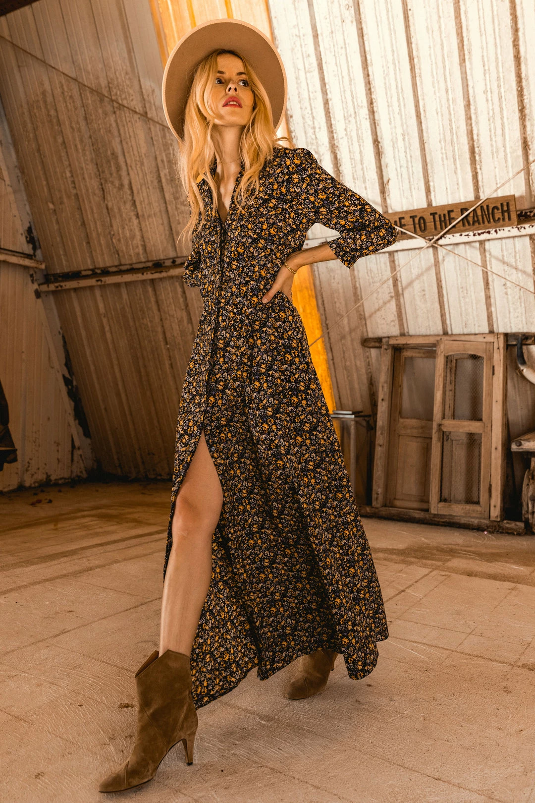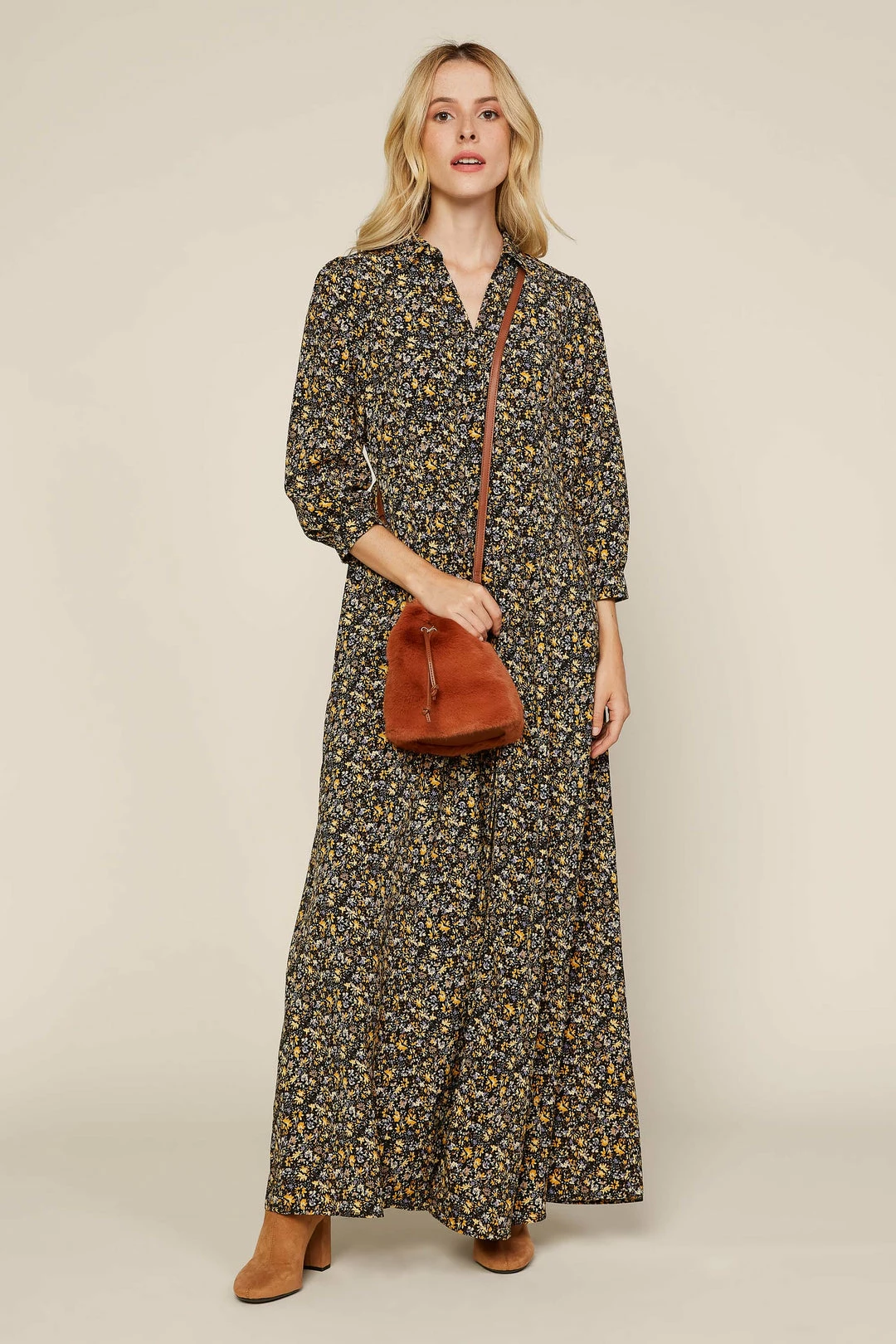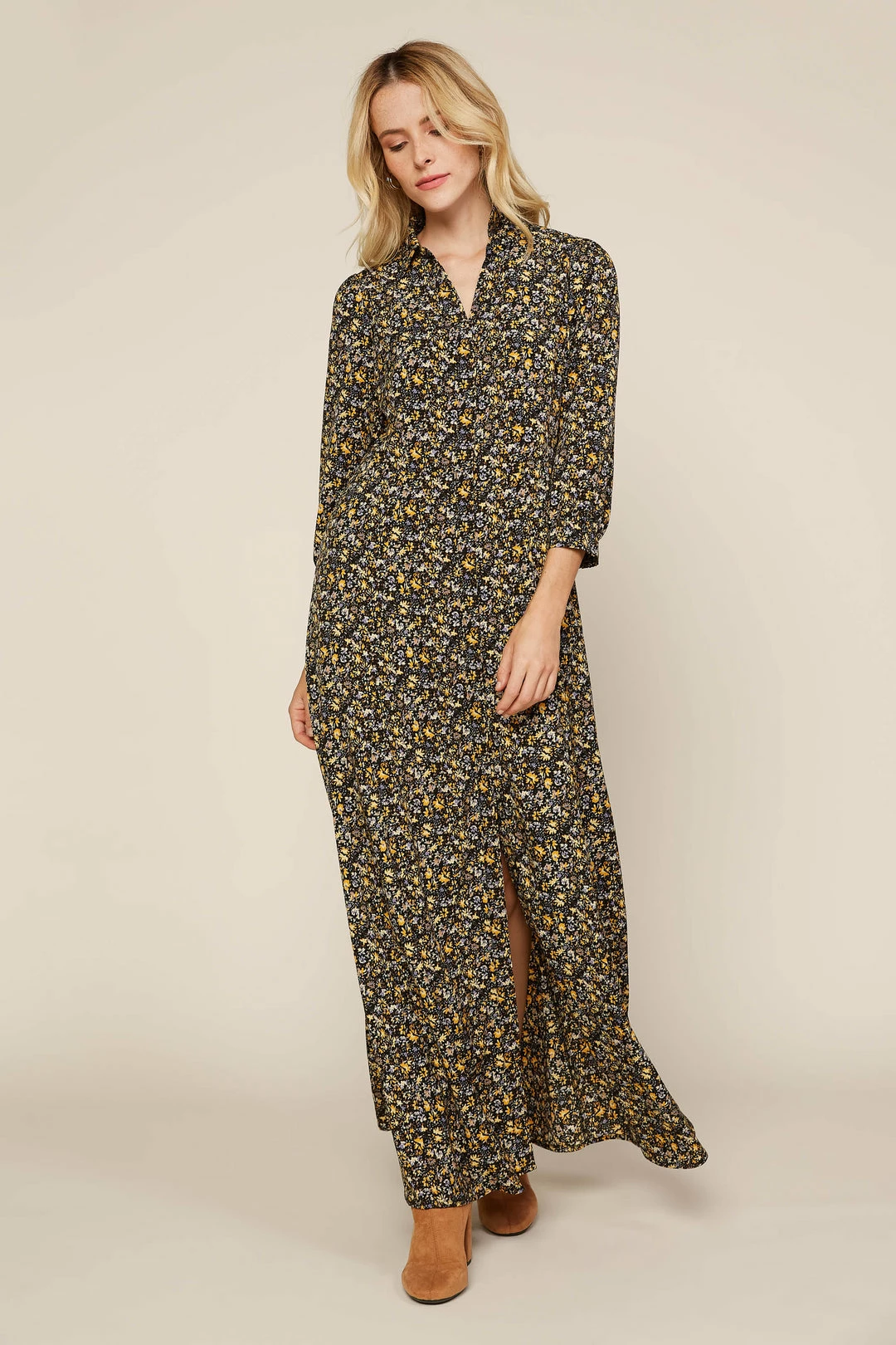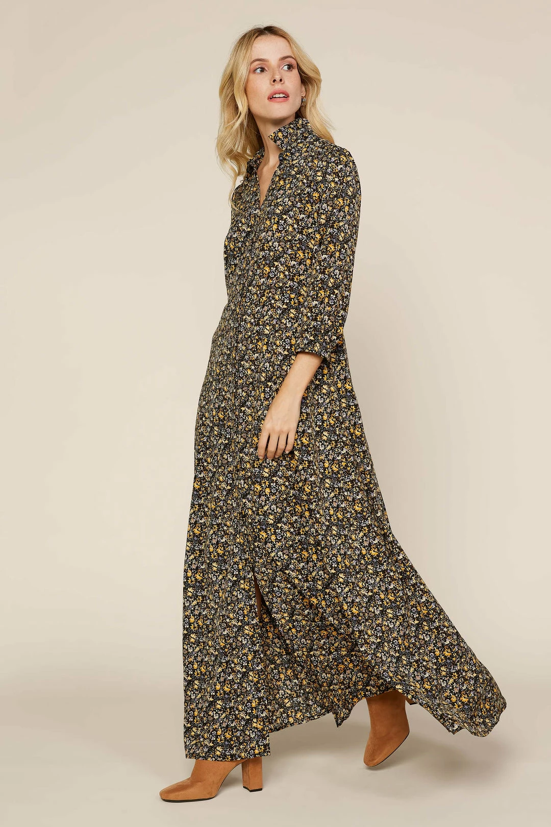 Featuring a ditsy floral print in a floor-skimming silhouette, this maxi shirt dress is just about the easiest outfit ever. It’s got a pointed collar and an open neckline that lends an inherently relaxed vibe, plus lots of buttons leading down to the hem. Leave a few undone for an even breezier look.