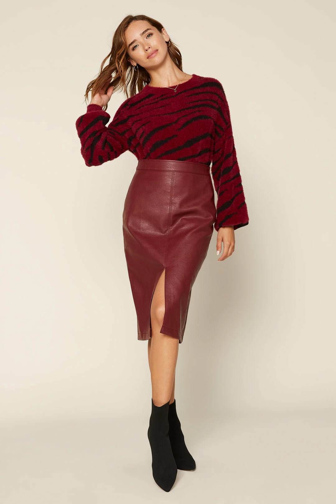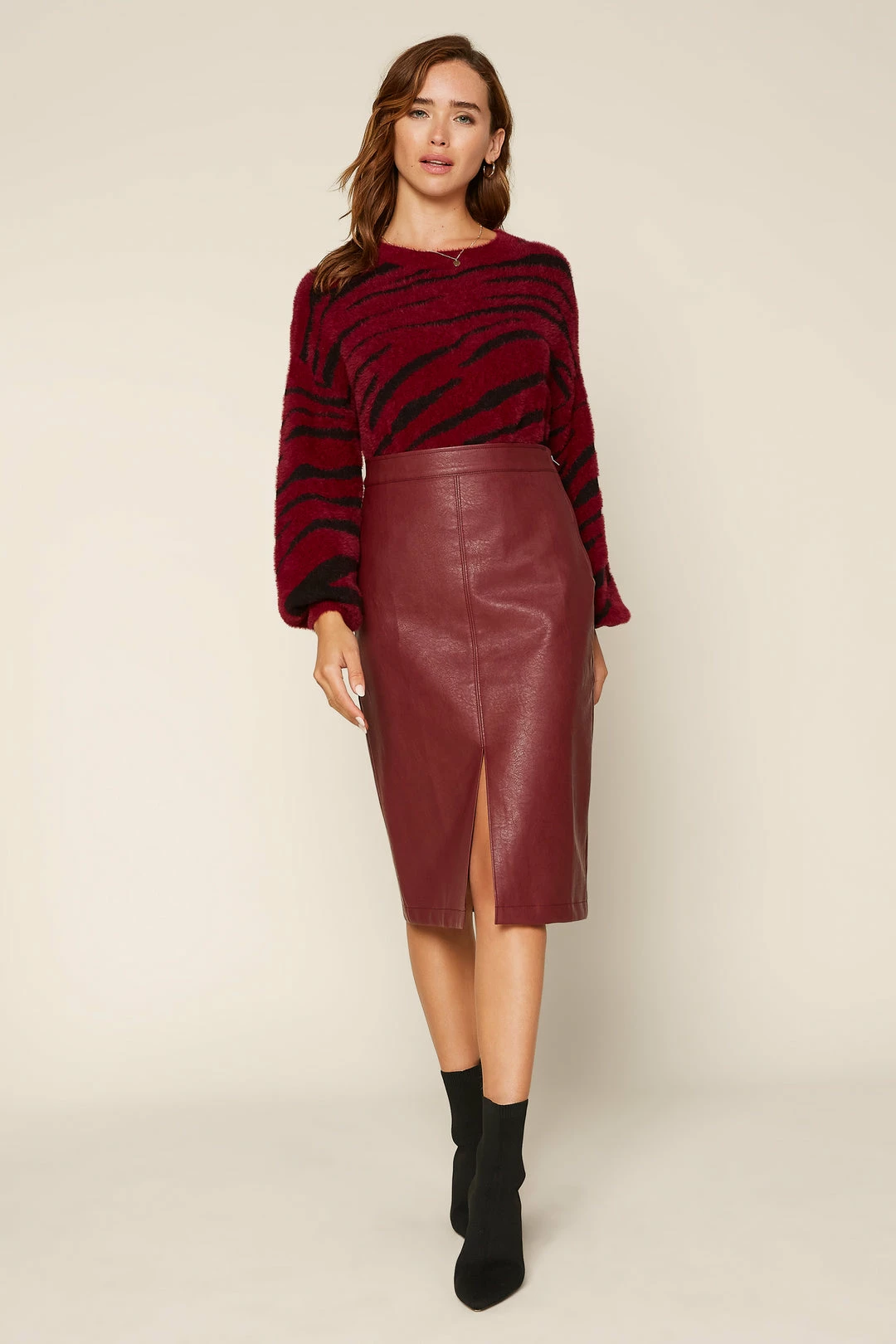 This vegan leather midi skirt feels sleek and sophisticated, done in a simple silhouette with a sexy front slit.