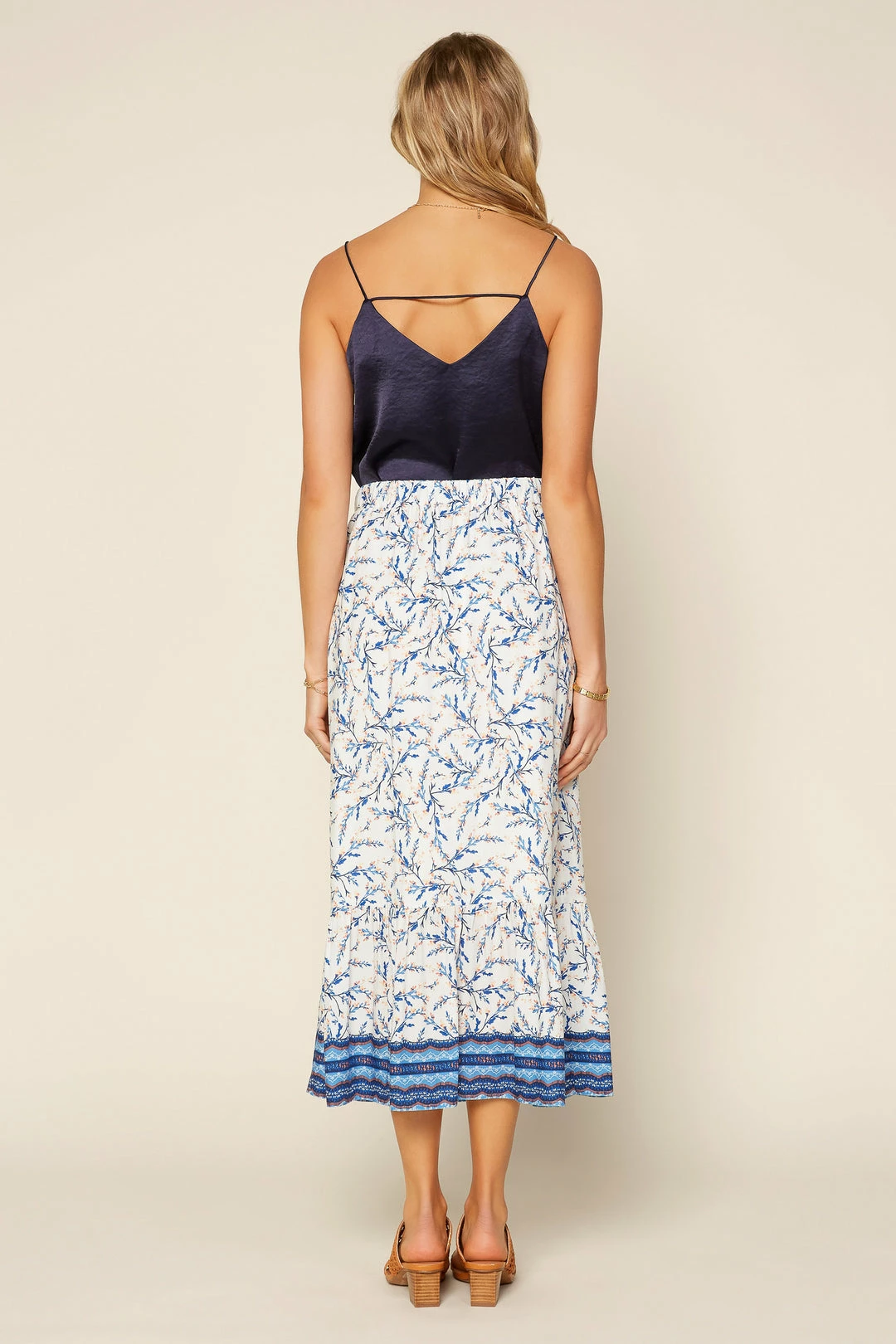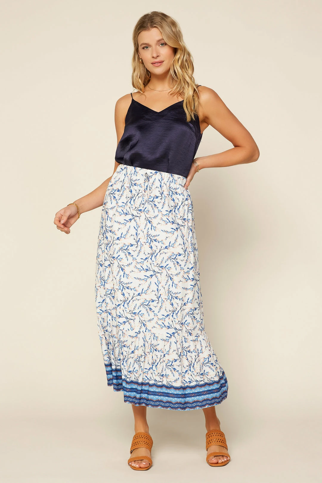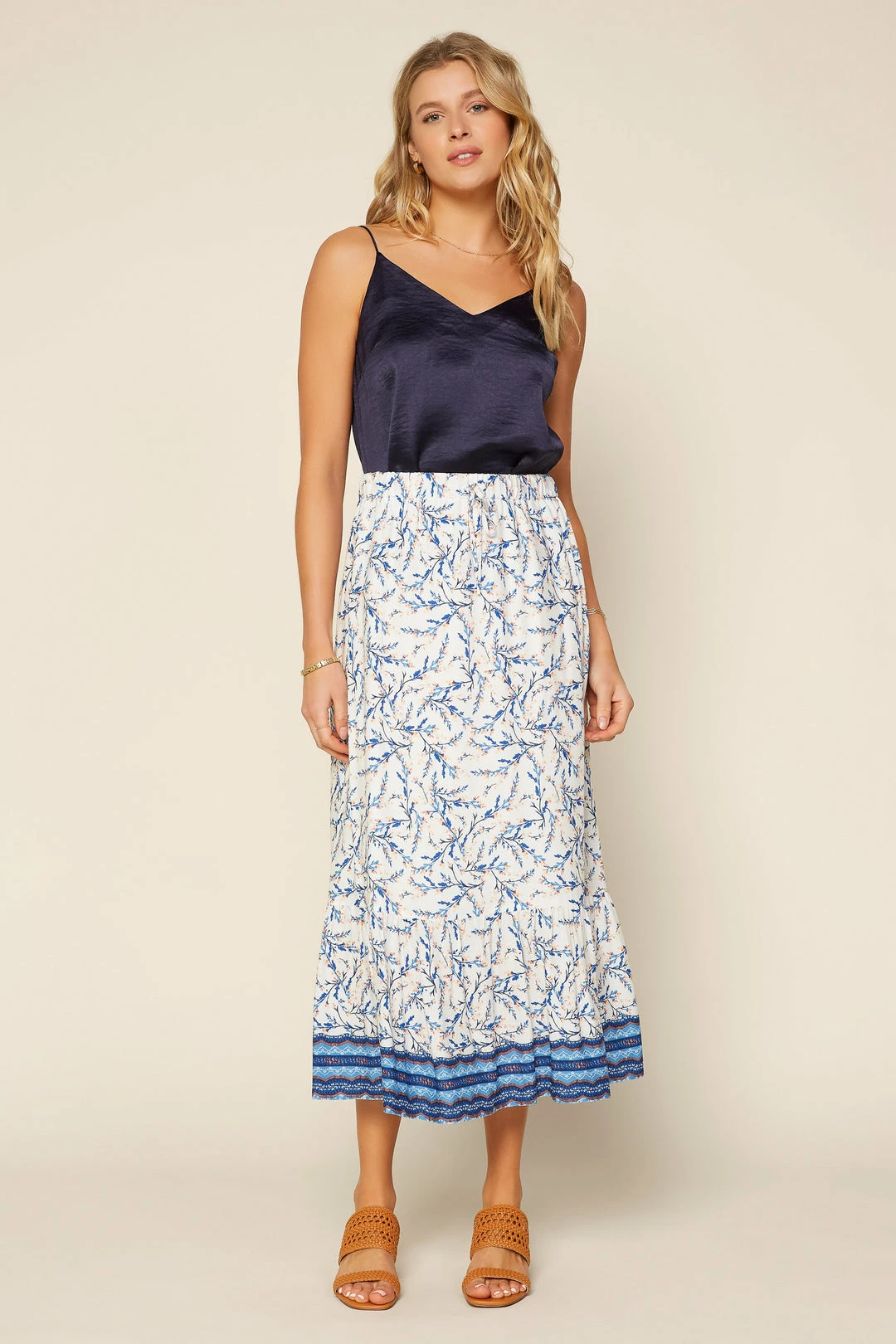 Life’s a breeze in this floral midi skirt printed with a striped border at the hem. Slip it on with a simple tank and sandals.