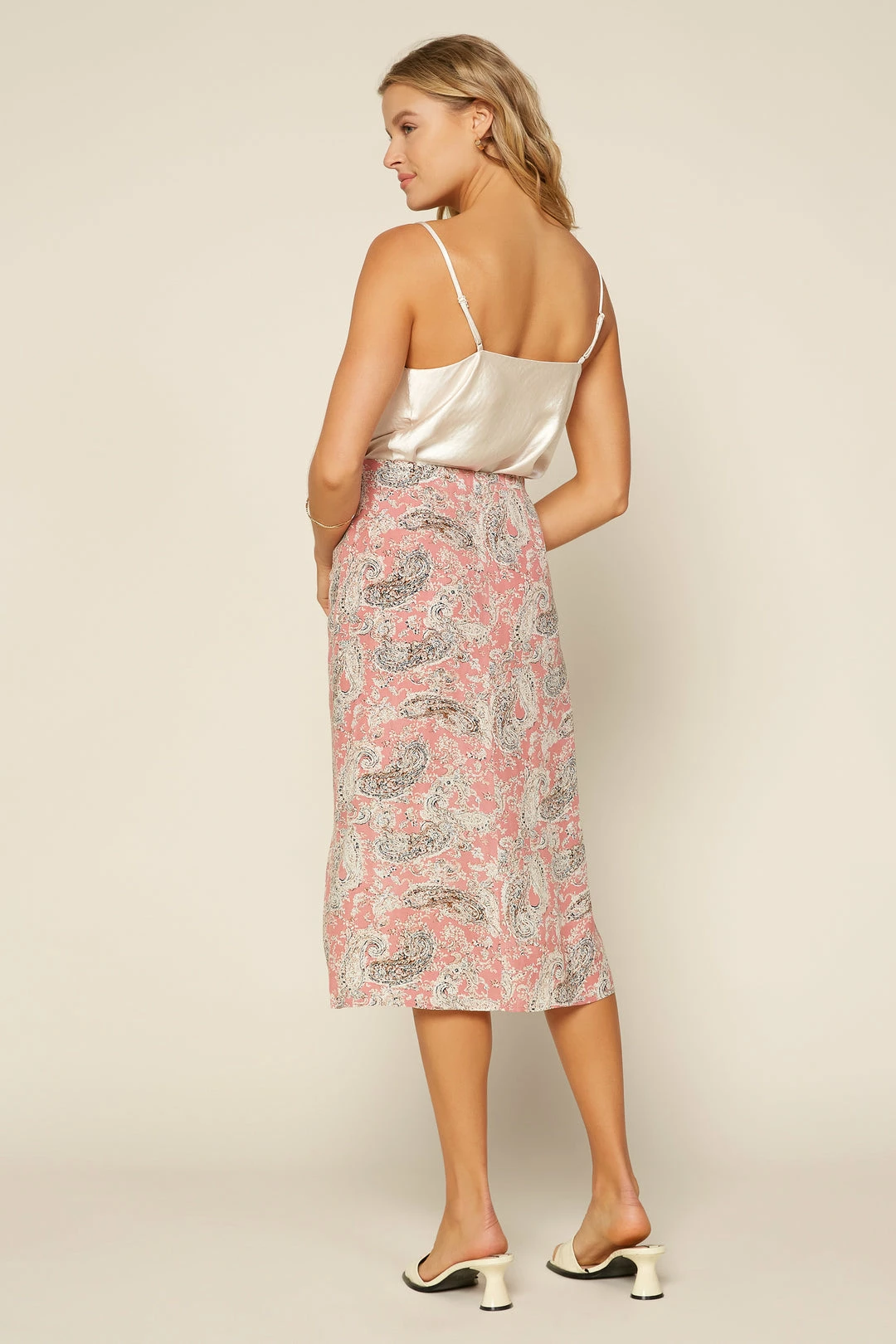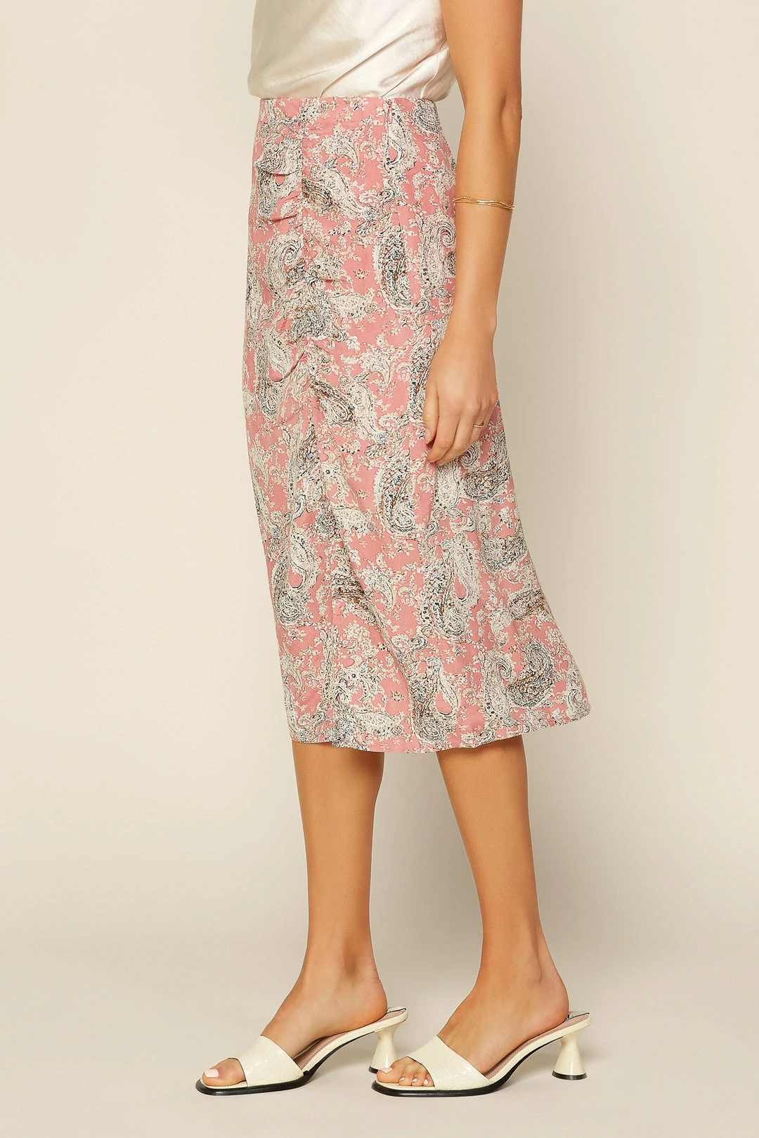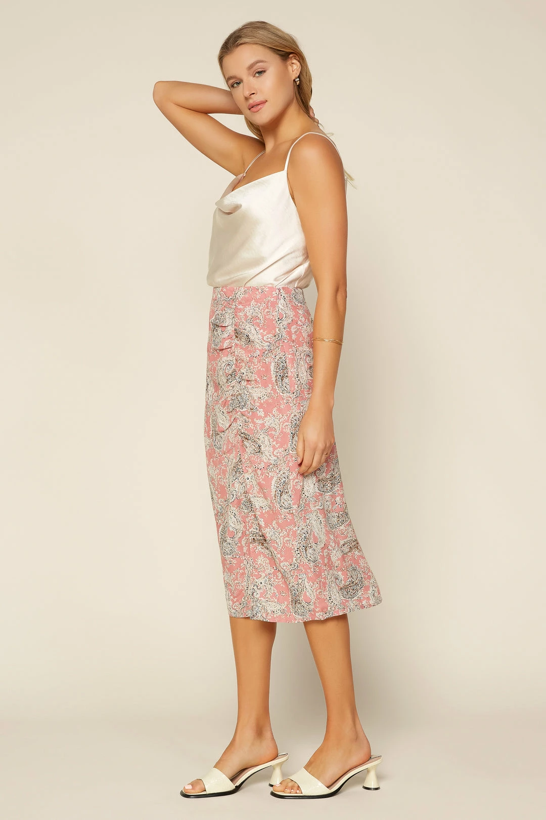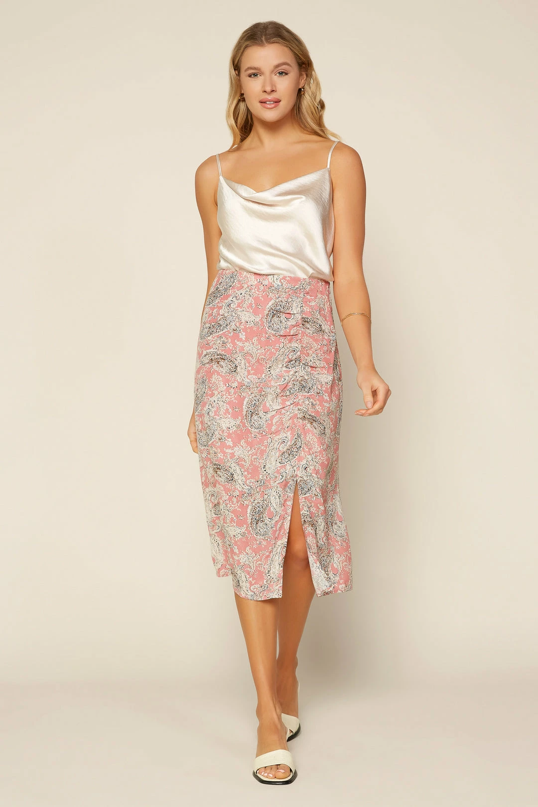 Printed with a pretty pink paisley motif, this shin-grazing midi skirt has ruching that leads to an alluring slit at the hem.