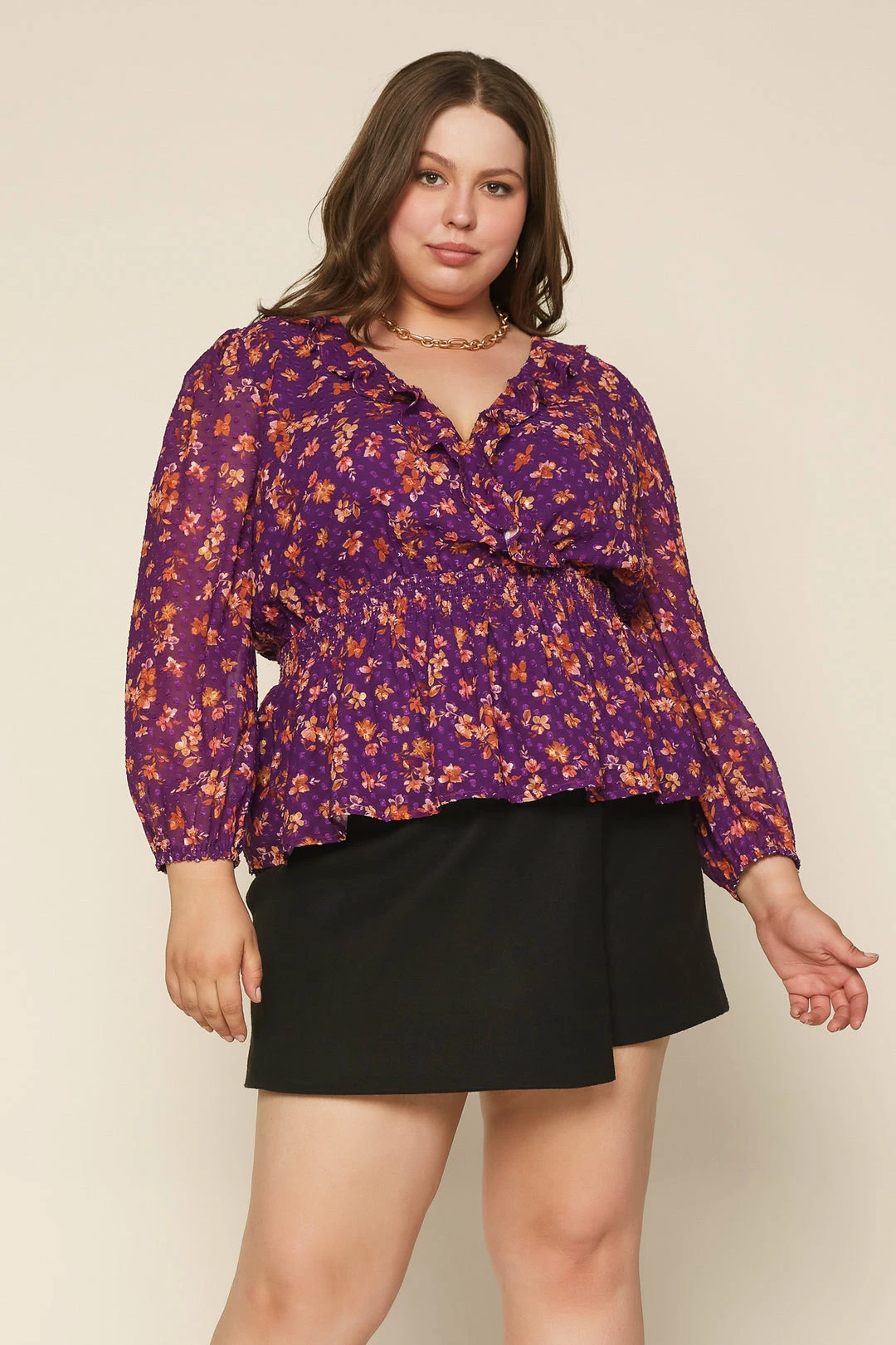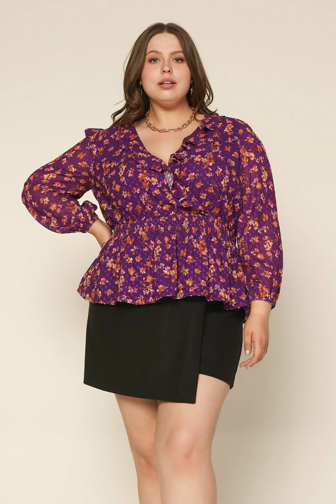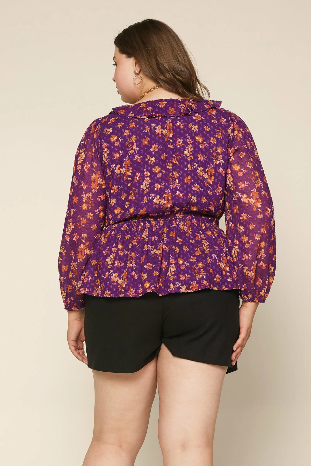 An enchanting floral print dresses up sheer swiss dot jacquard, energizing the cinched shape of this ruffled long-sleeve blouse.