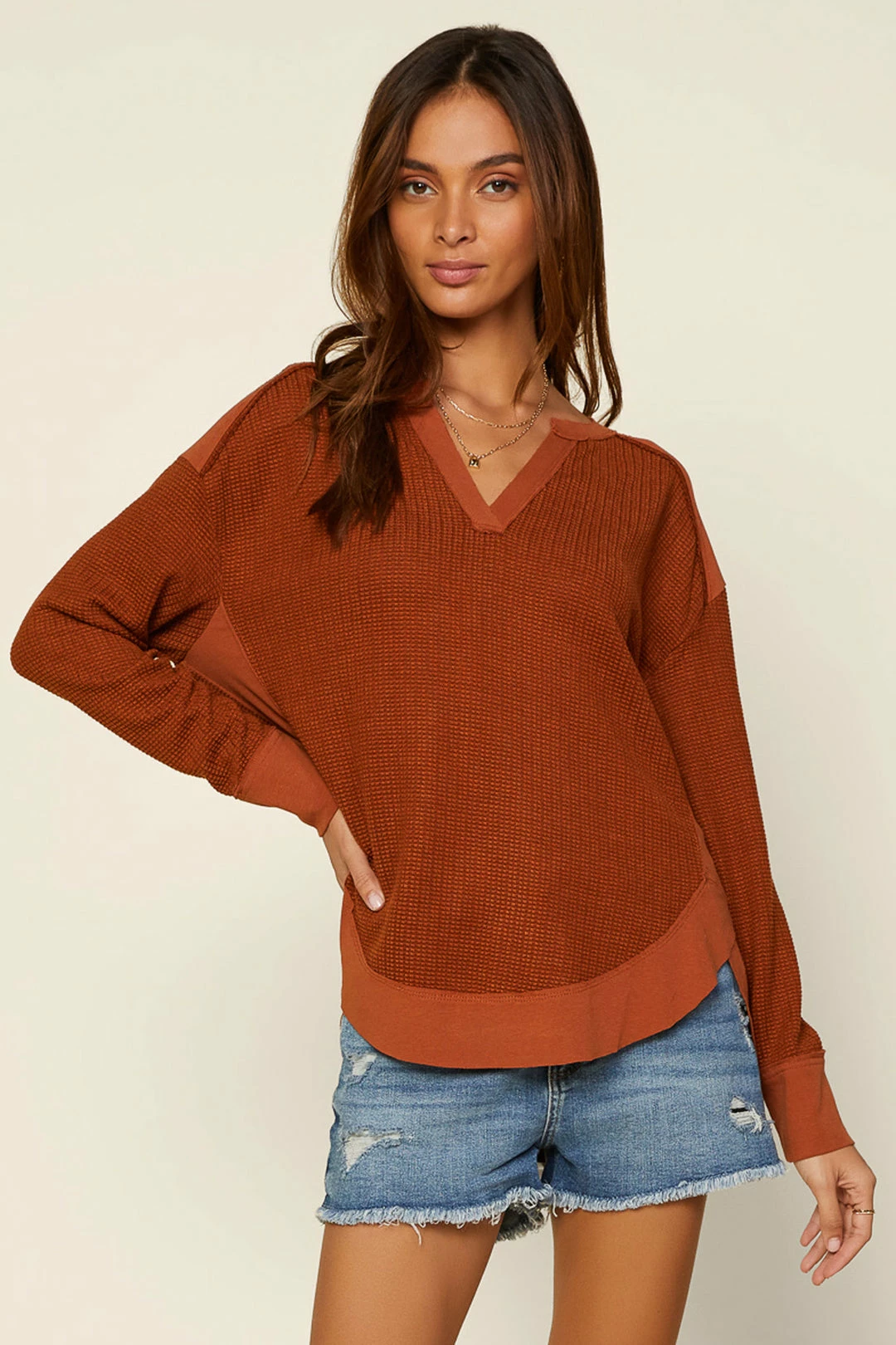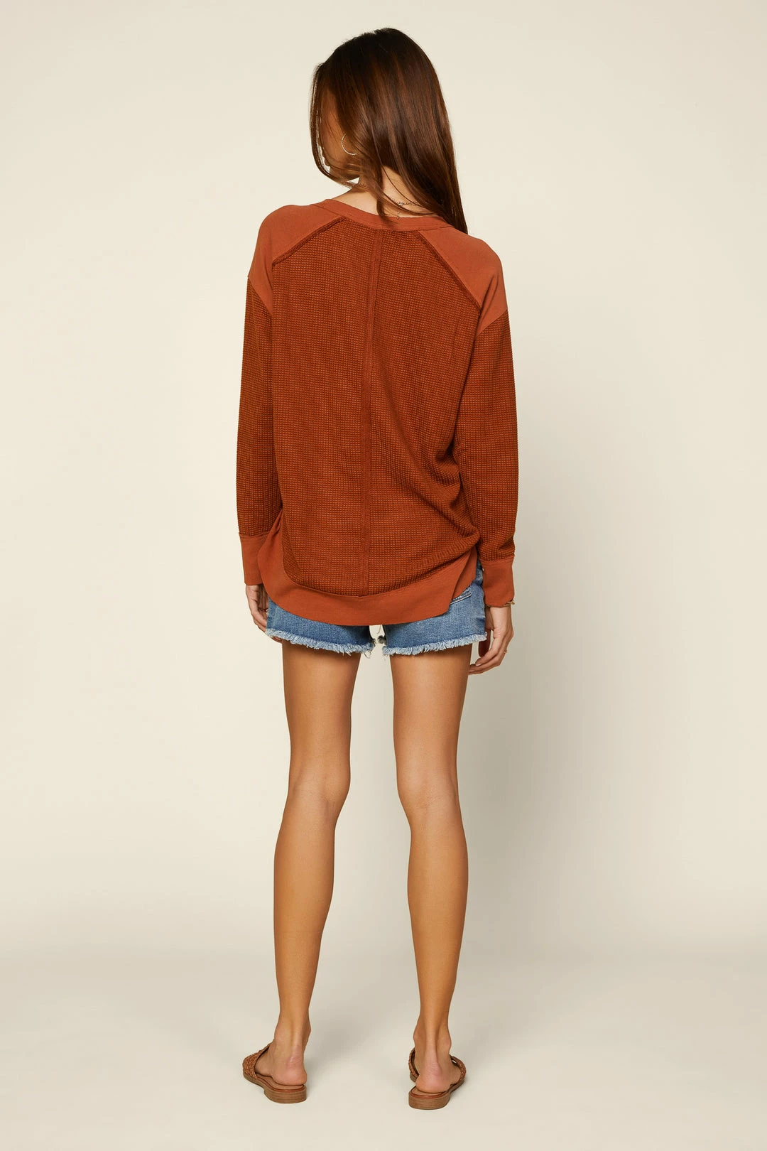 Bring some texture into your cool-weather wardrobe with this relaxed V-knit top crafted from a thermal waffle knit. The long-sleeve silhouette has a loose, easy fit that’s pieced with raw-edged jersey to highlight the split neckline, shoulder paneling, and curved hem.