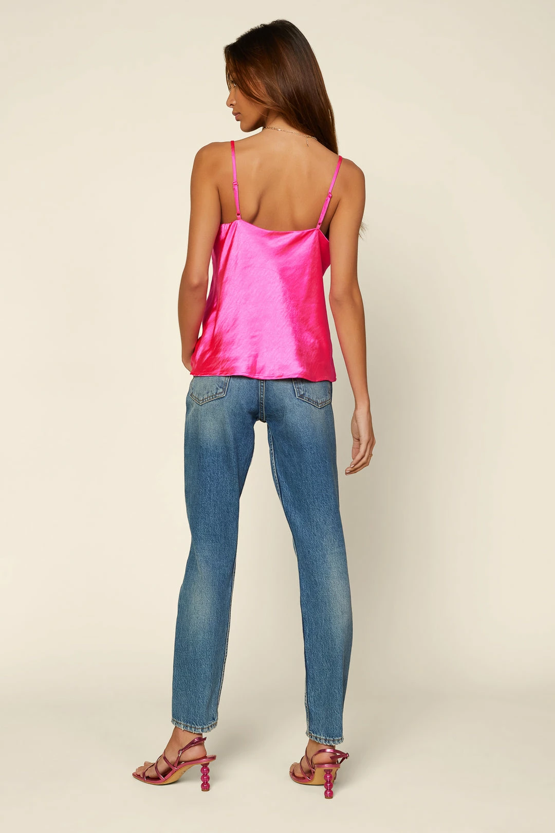 ’90s-inspired minimalism goes bold with this cowl-neck cami top in a striking shade of bright pink. Simple and sexy without a whole lot of effort, the strappy style punches up any look.