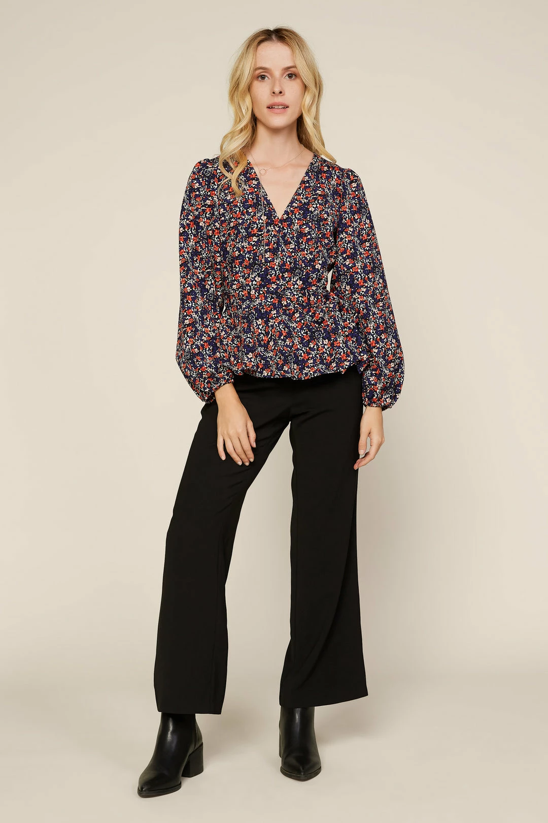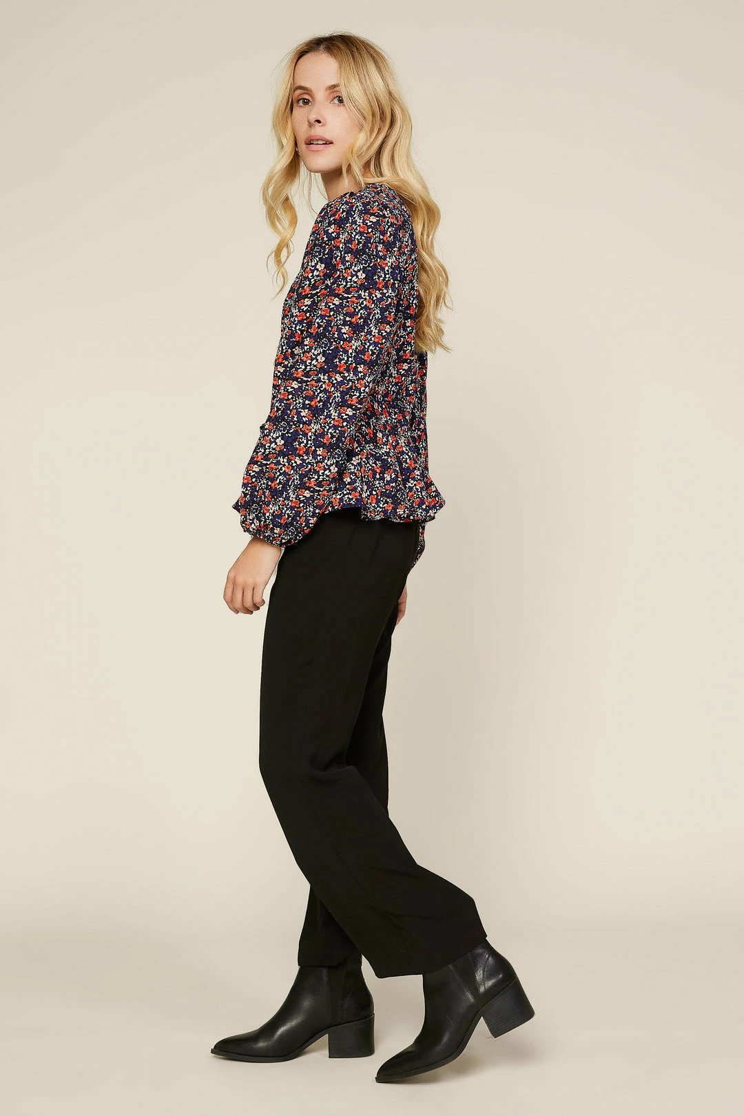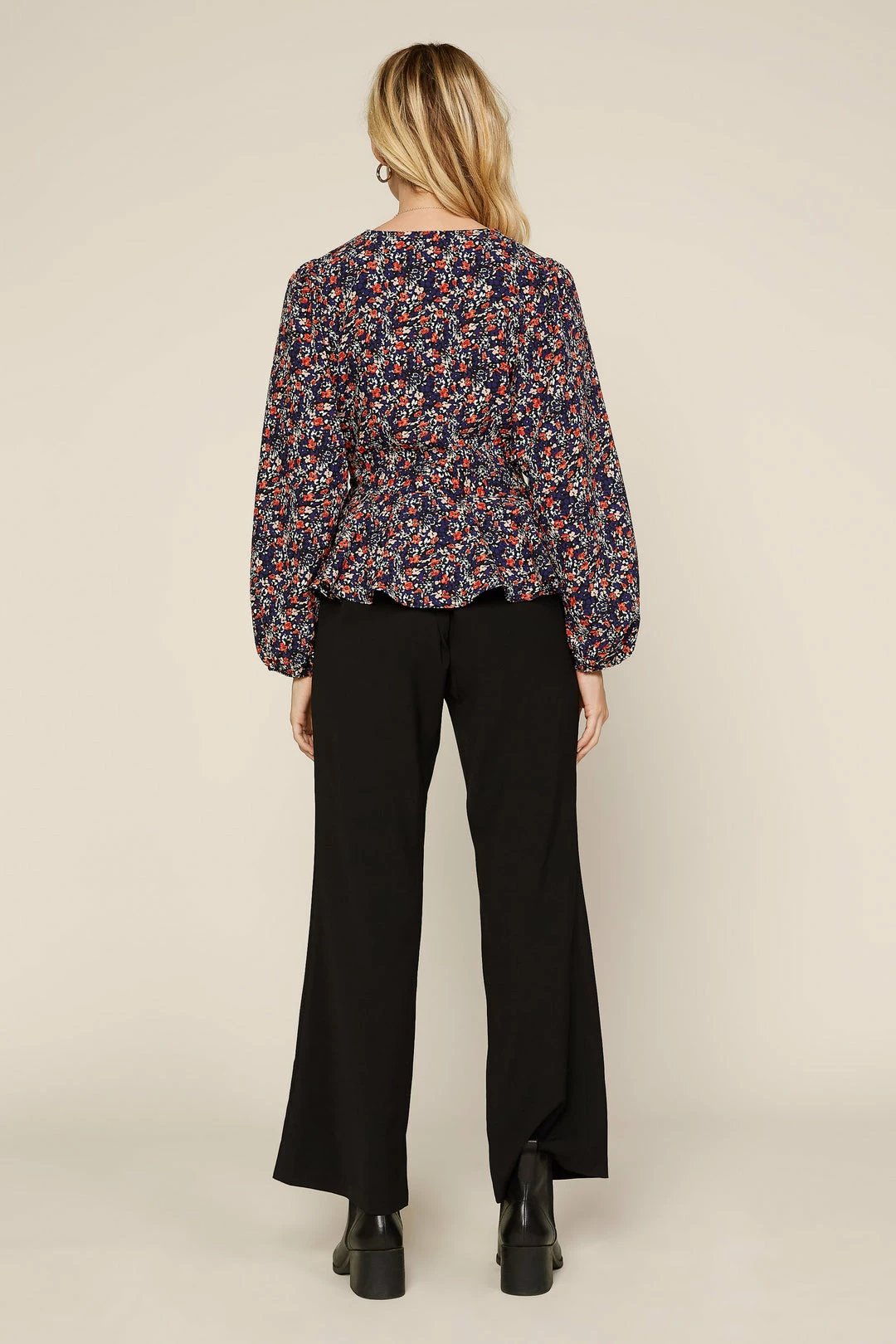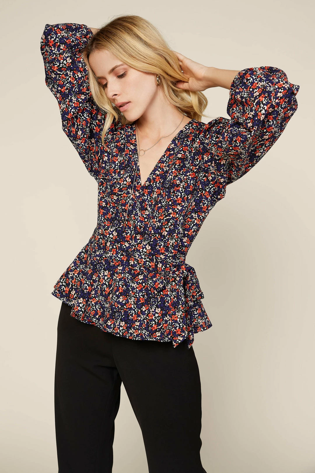 Charming in a ditsy floral print, this woven wrap top is set to be an uplifting element of your wardrobe this season. The puffed sleeves, side tie, and flouncy peplum make for a mood-enhancing look.