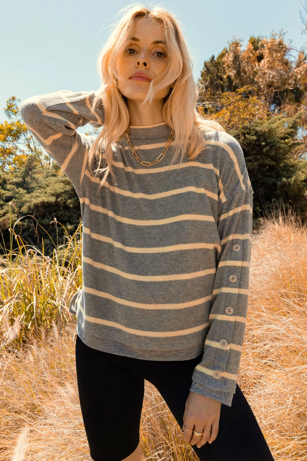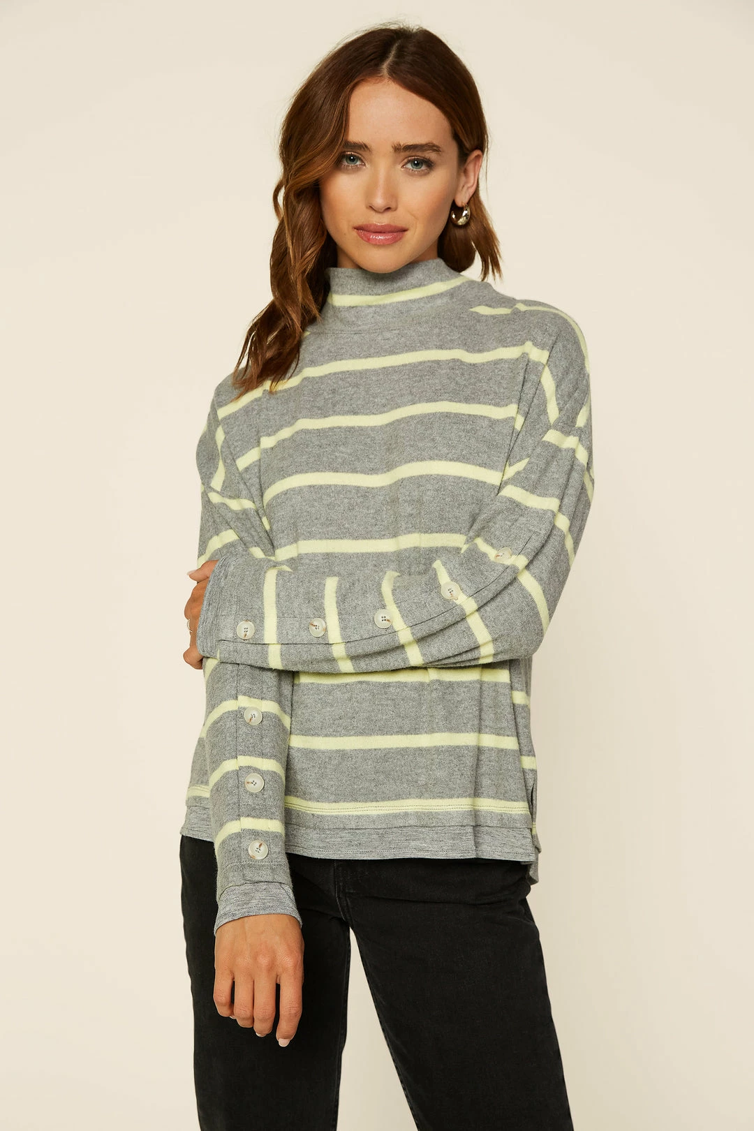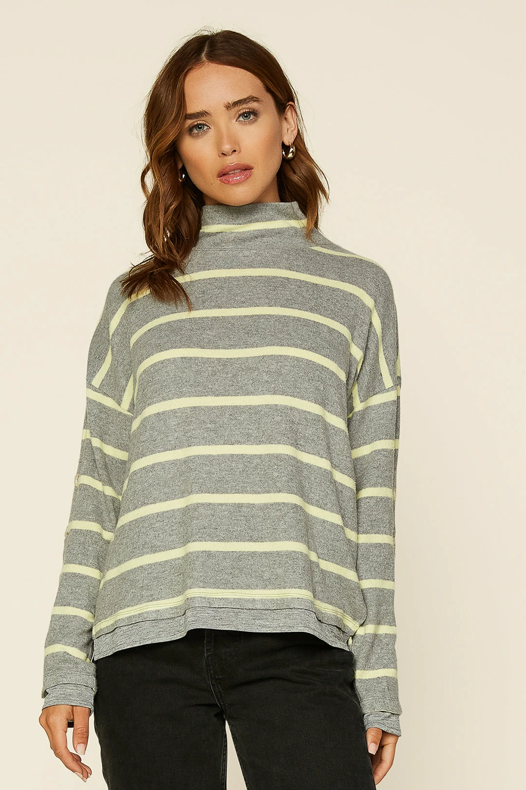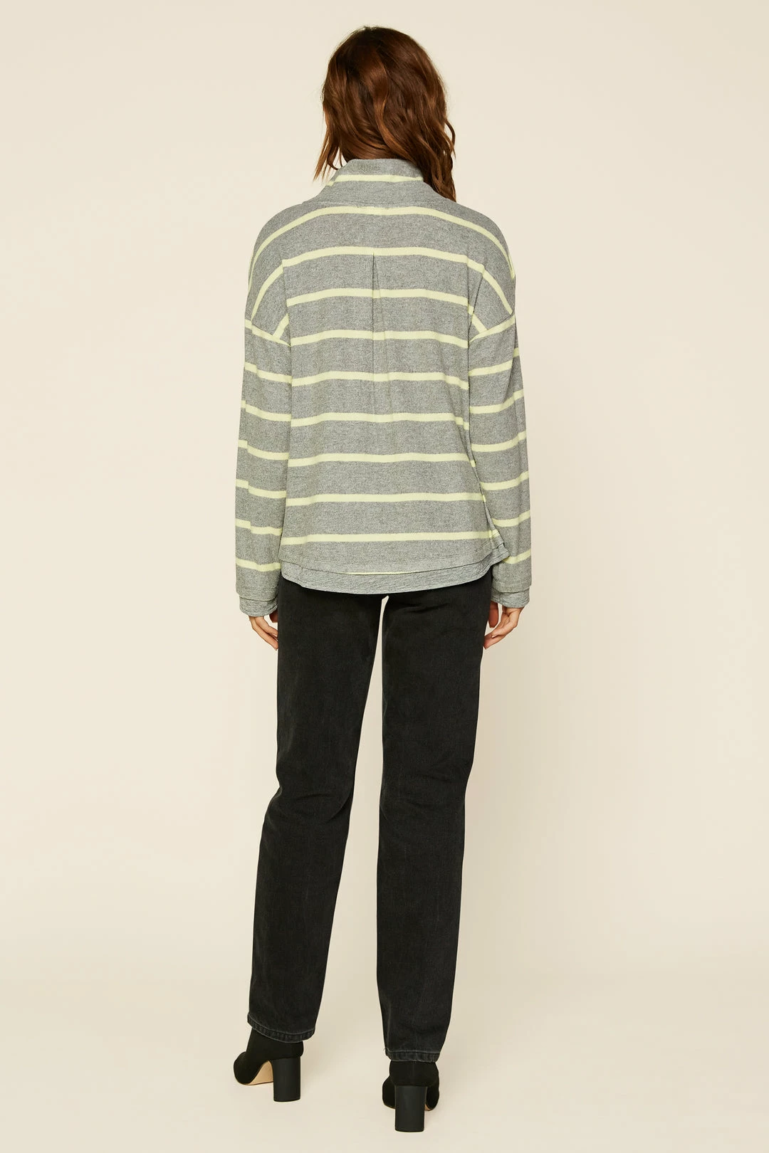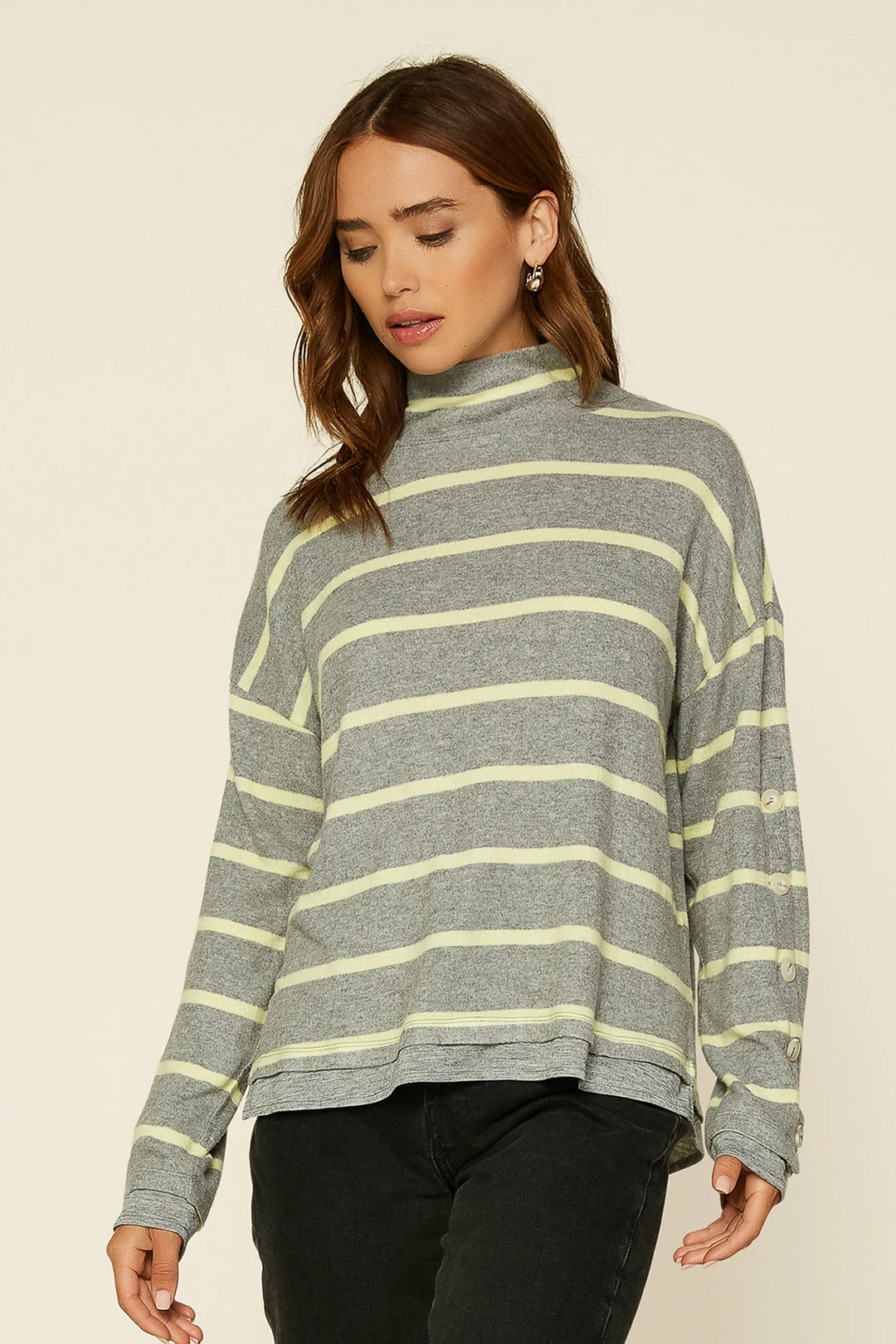 When you want cozy, reach for this striped knit top. It’s got a slouchy funnel neck and pleating at the back to enhance the easy silhouette. Note the hemline and cuffs: they’ve got an extra layer of heather grey knit peeking out.