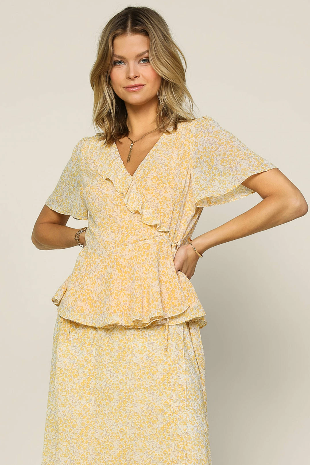 A lovely addition to your spring wardrobe, this floral-print wrap top is ruffled at the neckline and ties at the side to cinch the shape. Goes best with sunshine and a warm breeze.