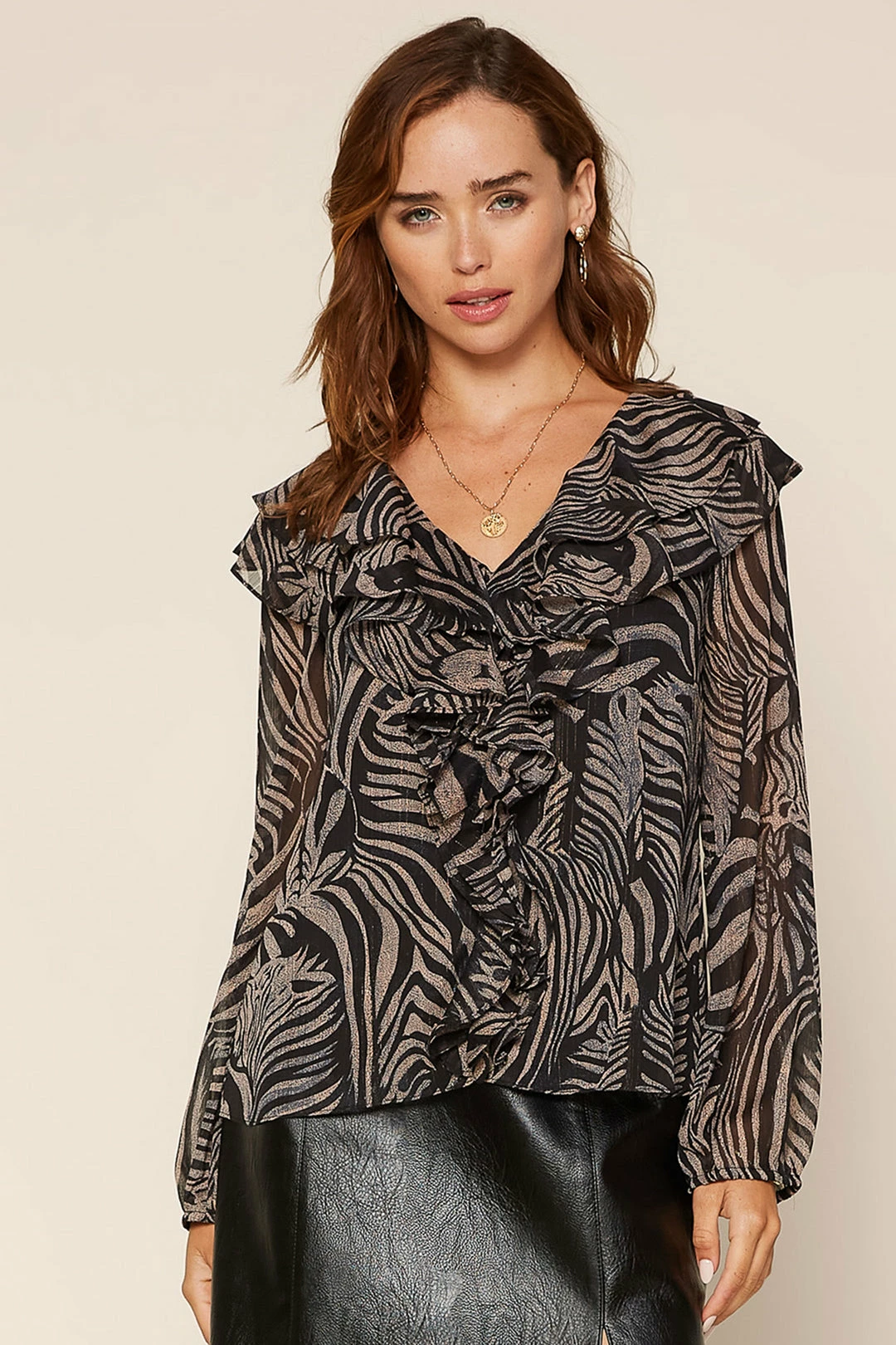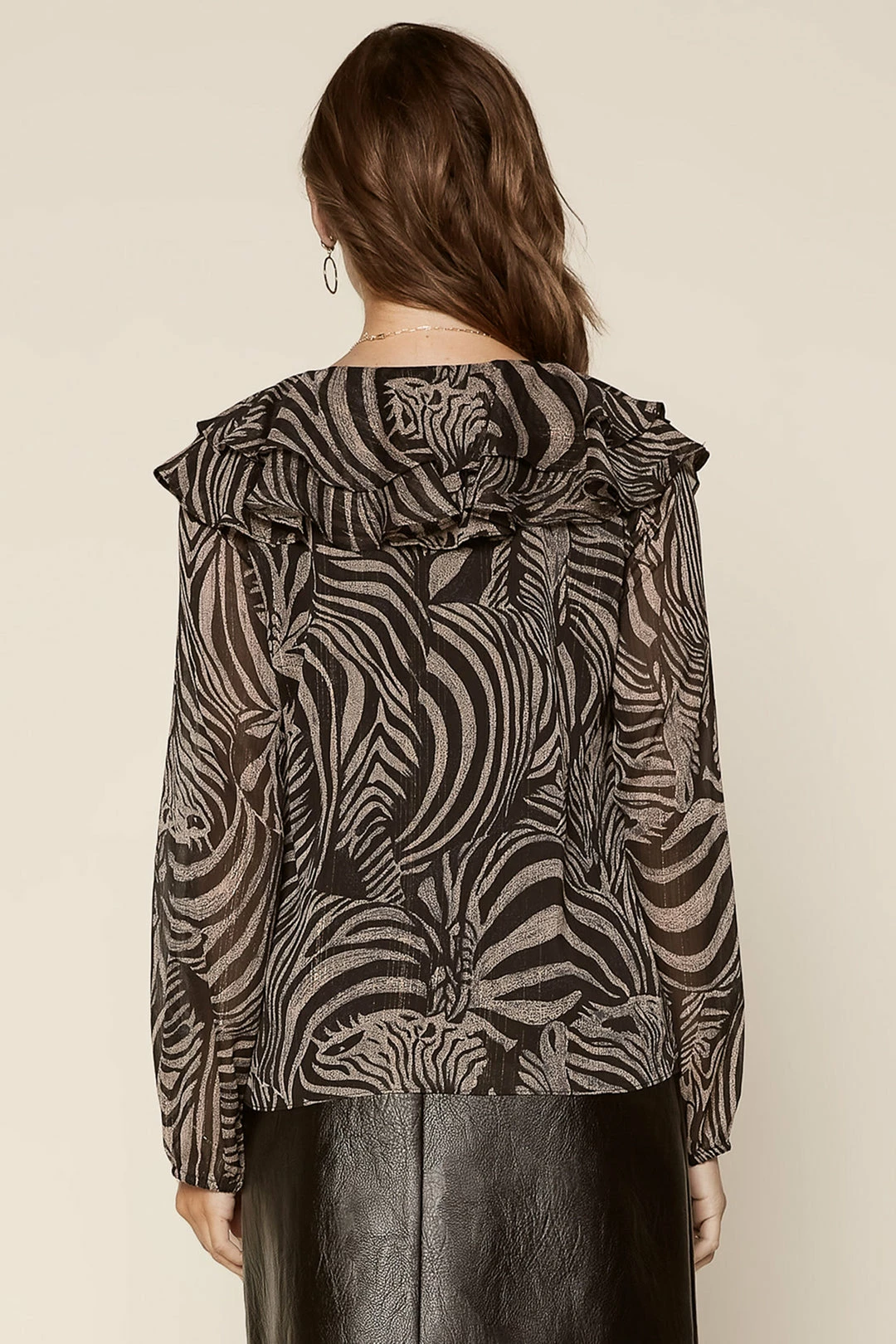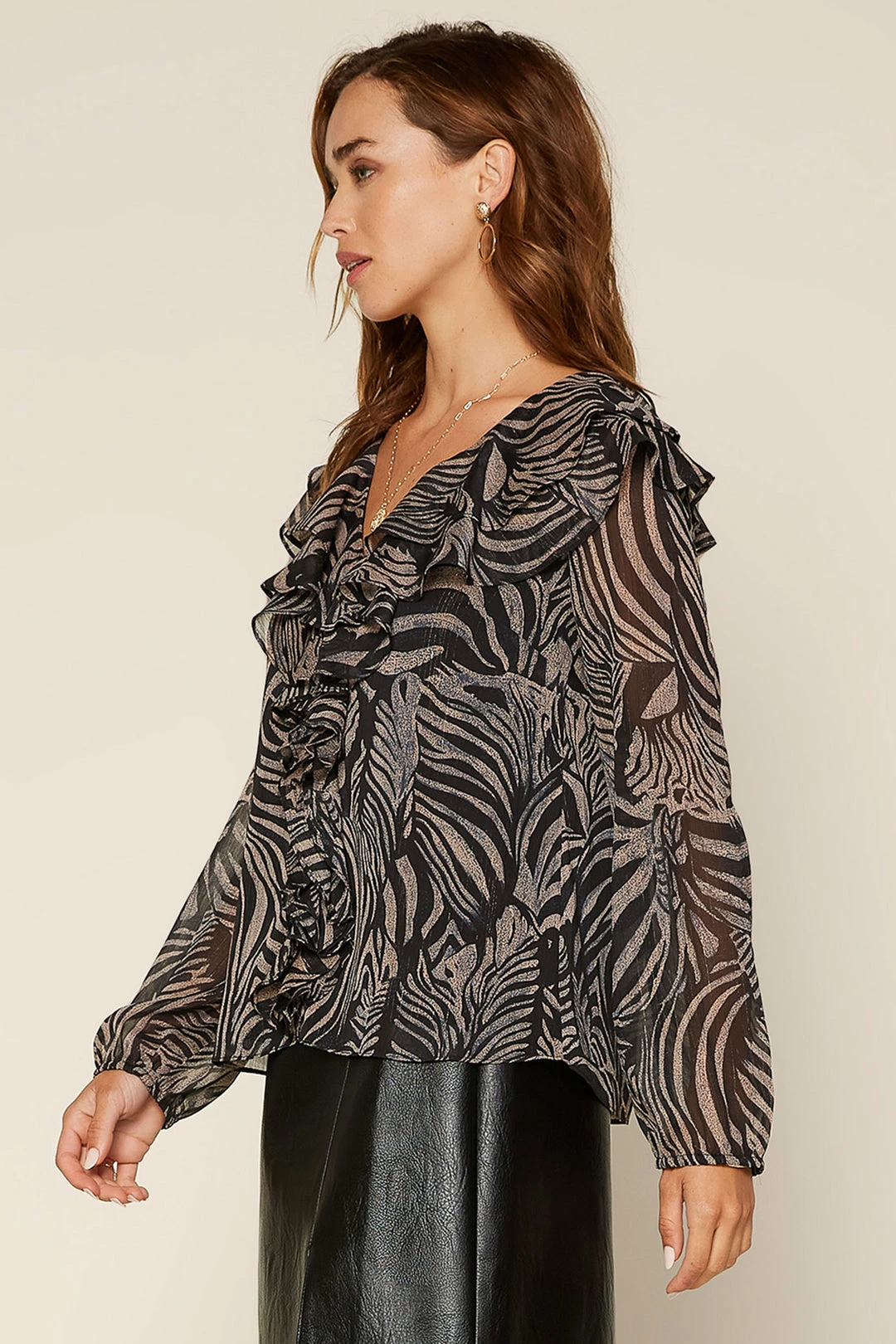 A swirling zebra print captivates on this sheer woven top featuring long sleeves and tiers of fluttery ruffles.