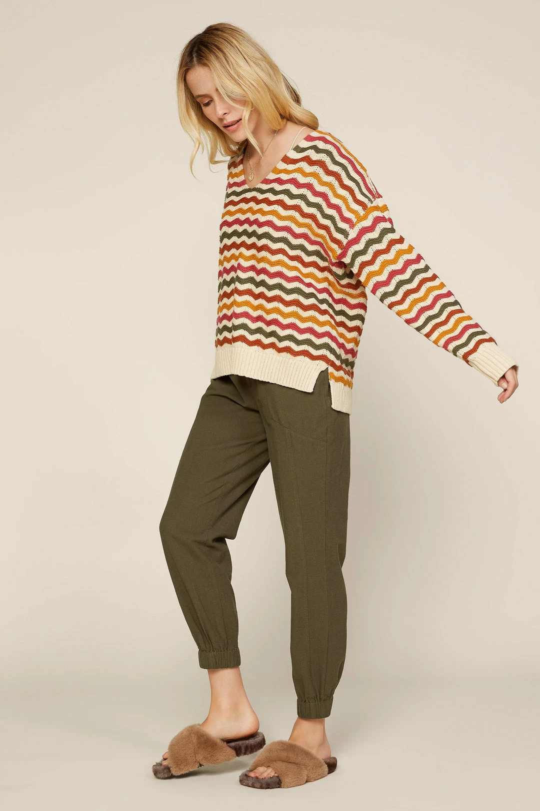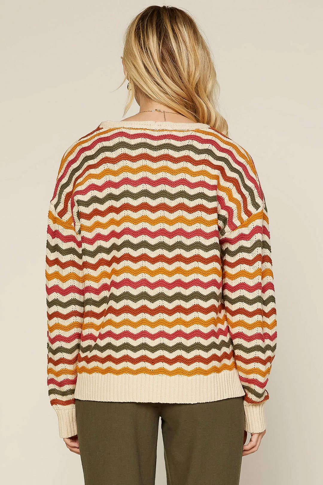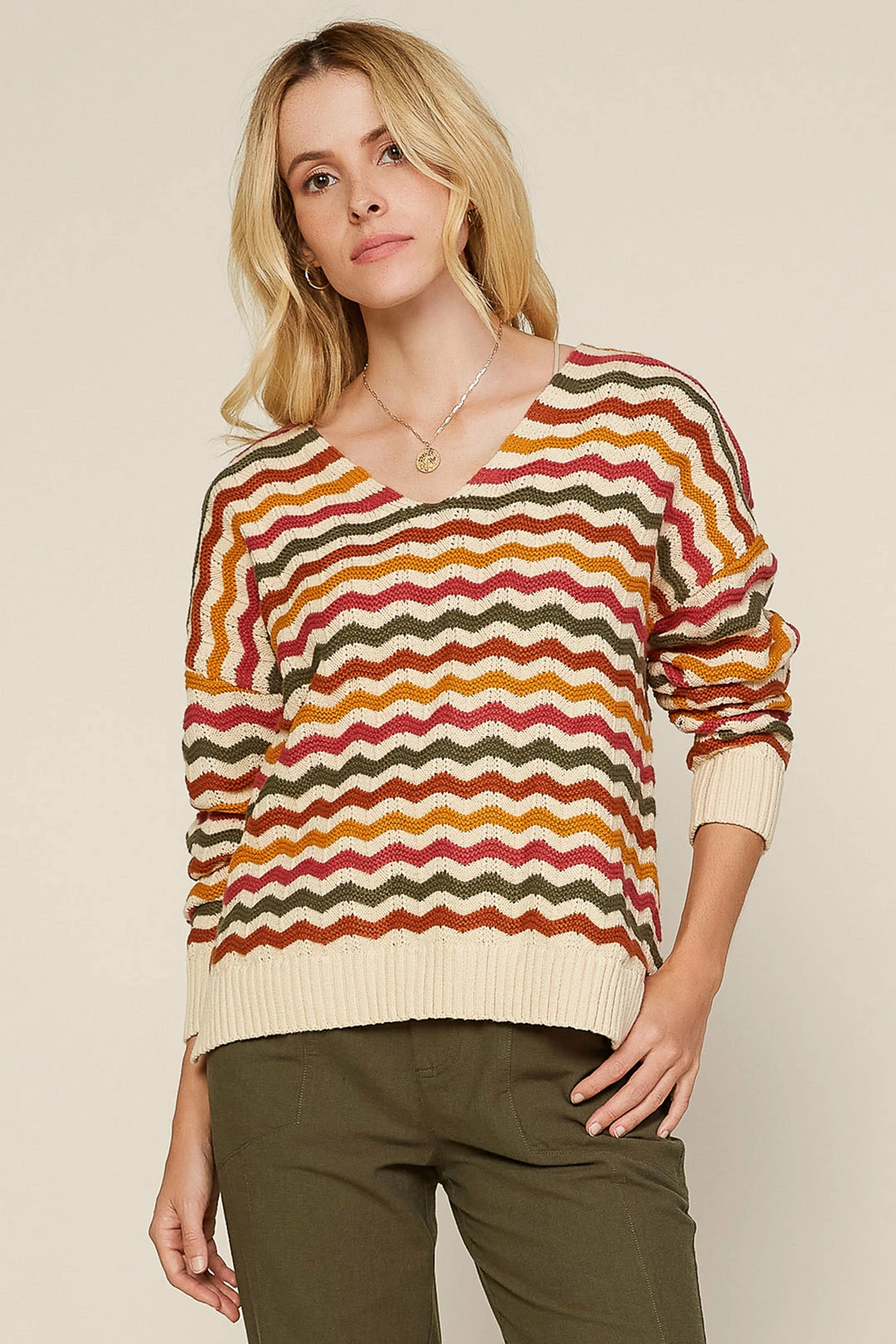 Multicolor zigzag stripes make this V-neck sweater a favorite for keeping cozy in brisk fall weather. Finished with ribbed cuffs and hem.