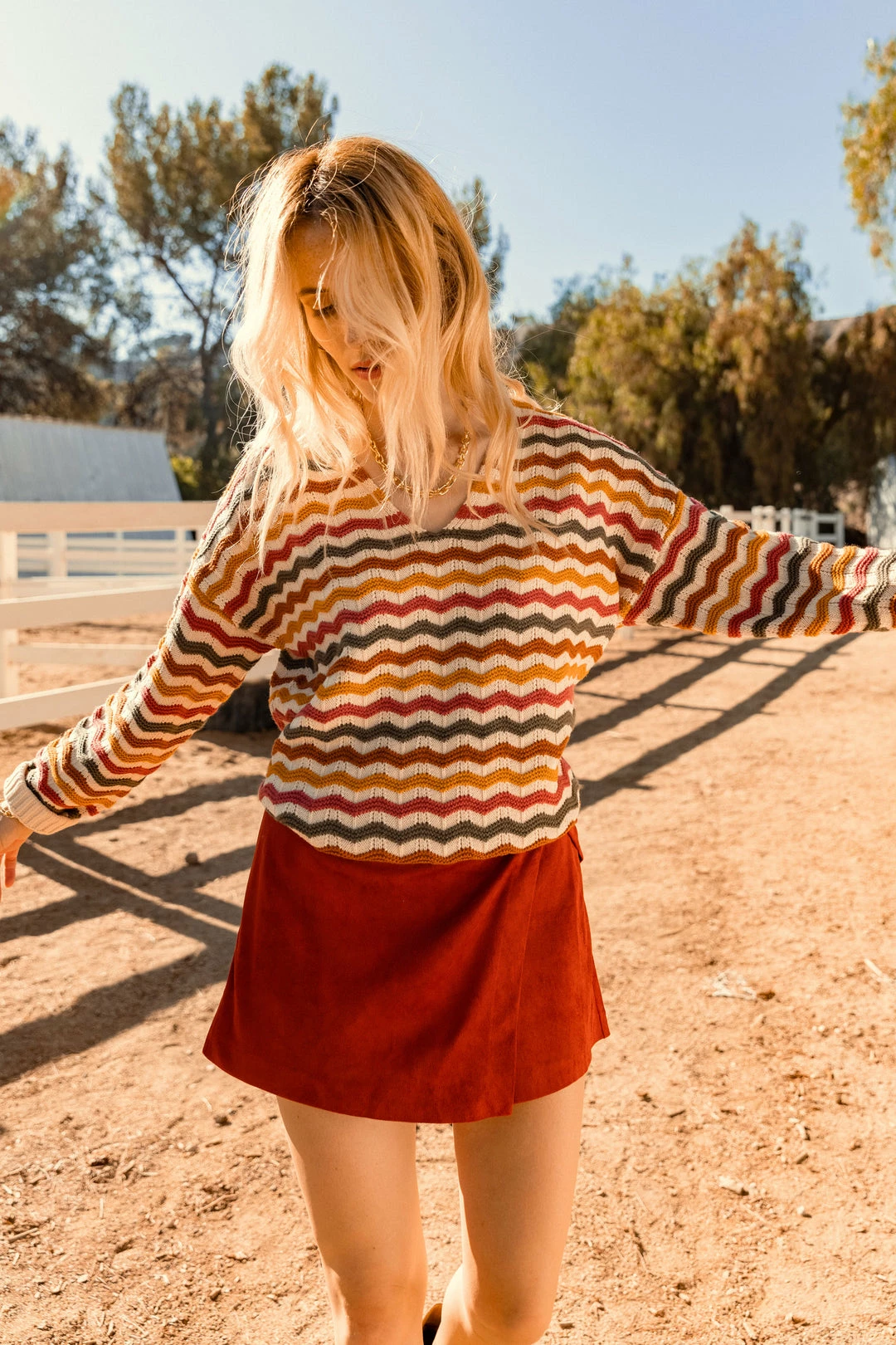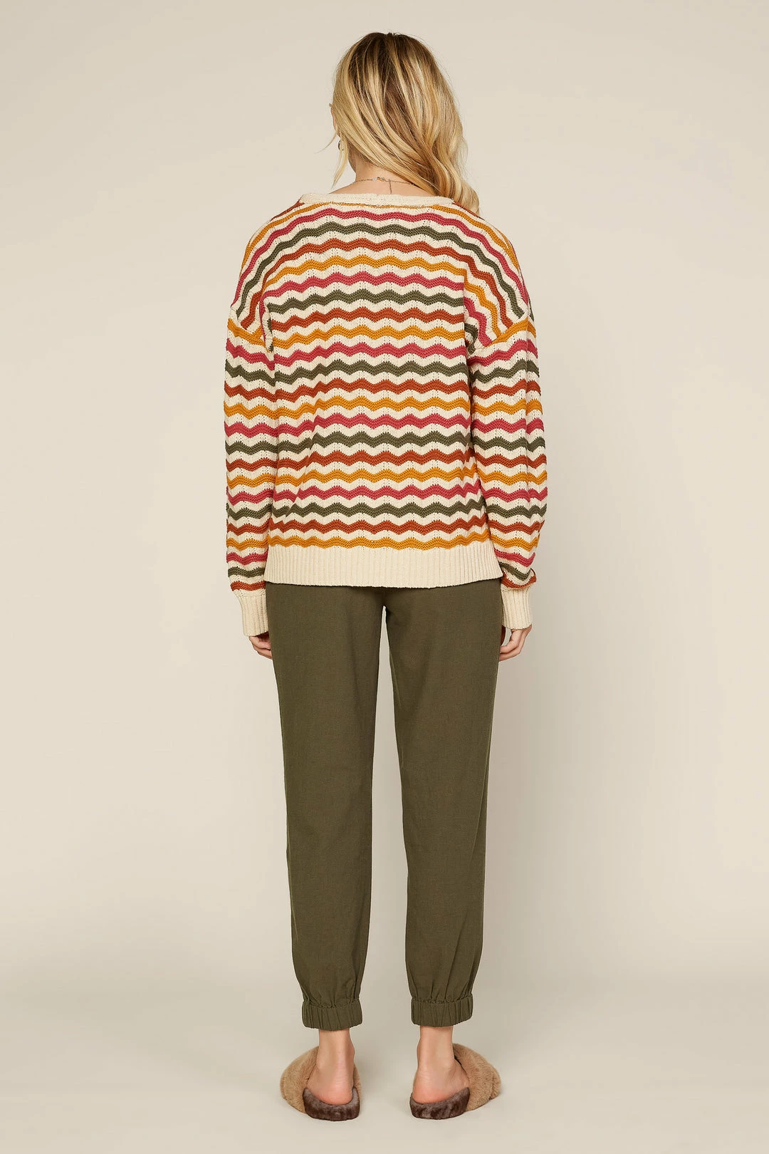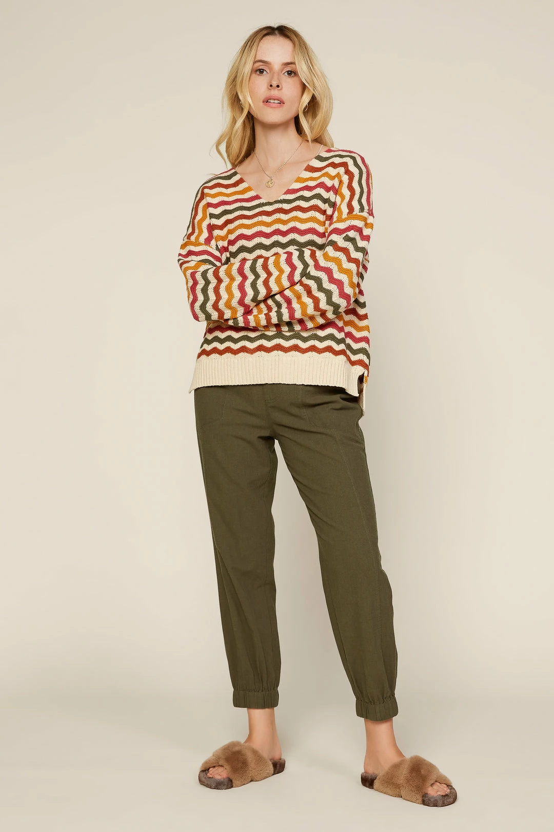 Multicolor zigzag stripes make this V-neck sweater a favorite for keeping cozy in brisk fall weather. Finished with ribbed cuffs and hem.