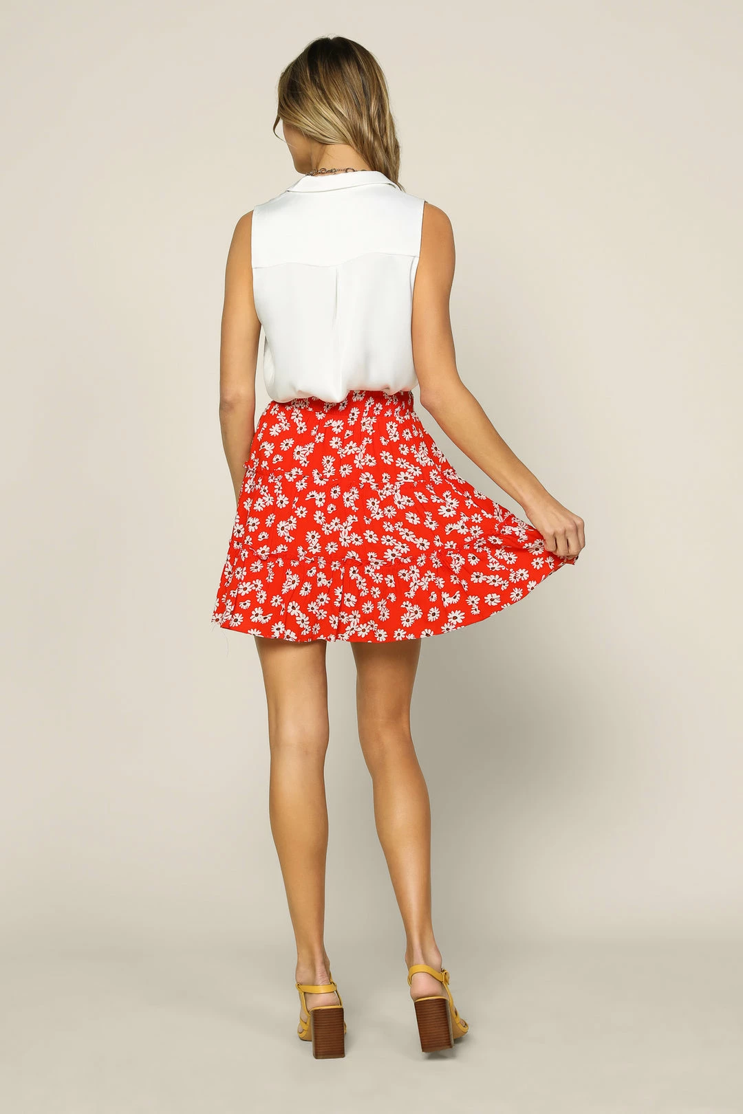 Fresh as a daisy. This floral-print mini skirt is feminine and playful, fitted by an elasticized waist before falling to a tiered A-line shape.