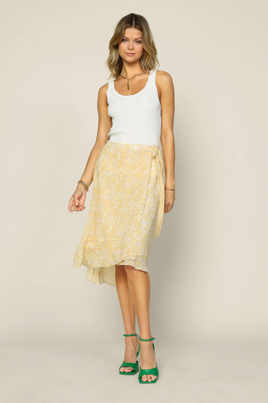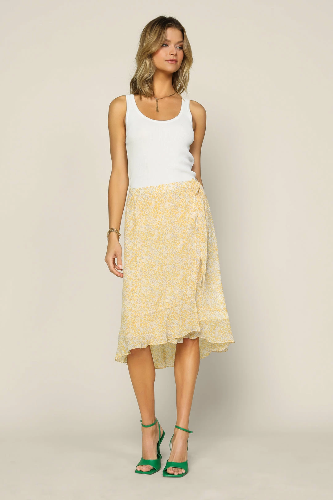 Spring in skirt form. This float-on-air midi skirt features a sunny floral print and wrap styling that ties into a bow at the side waist. A ruffled high-low hem completes the look.