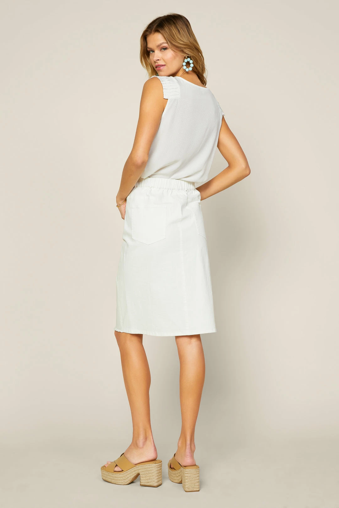 Done in a light, summery wash, this knee-length denim skirt looks equally on point paired with a simple knit tank or something on the more polished end. Metal buttons march down the front, leading to a softly frayed hem. Contrast stitching finishes the look, accenting the classic scoop pocket construction.