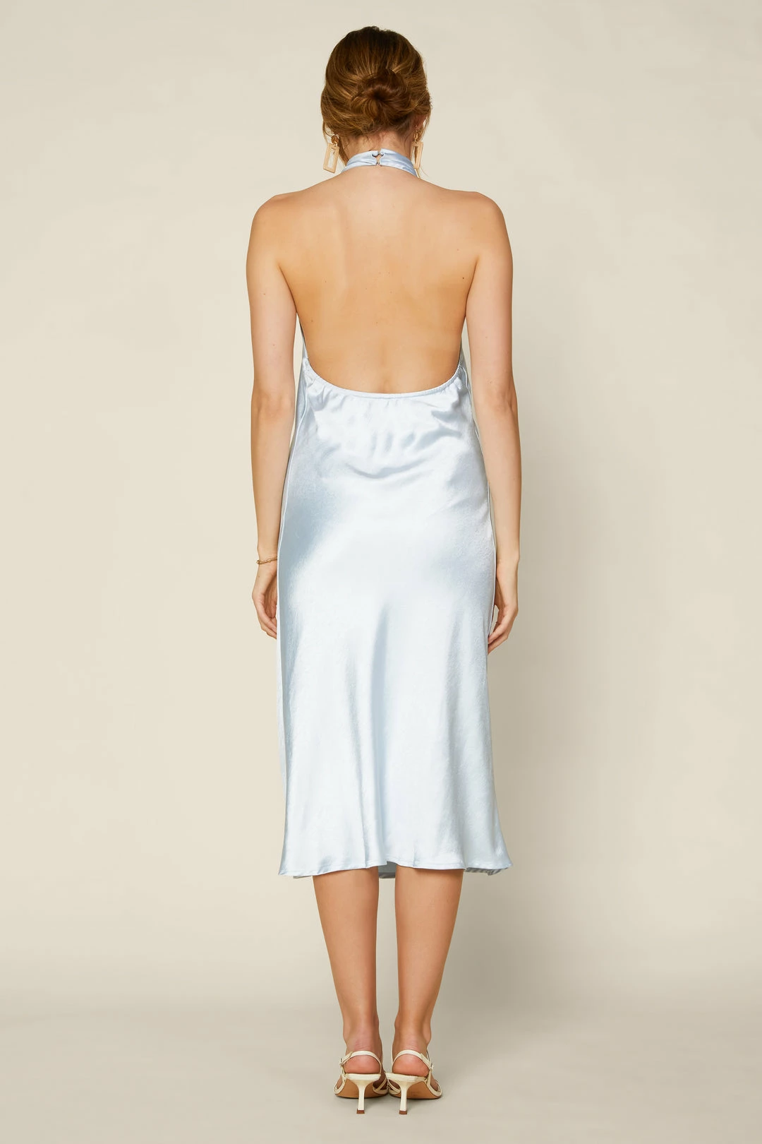 This satin midi dress has a femenine halter neckline with a keyhole opening, completed with a revealing open back.