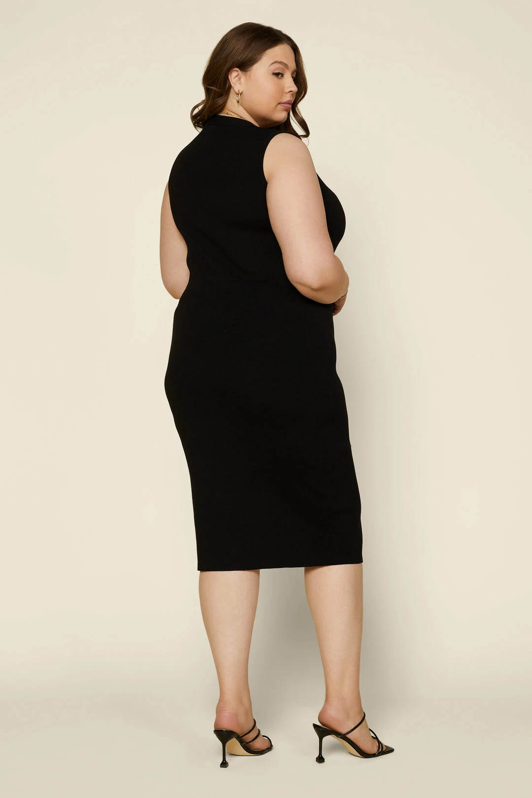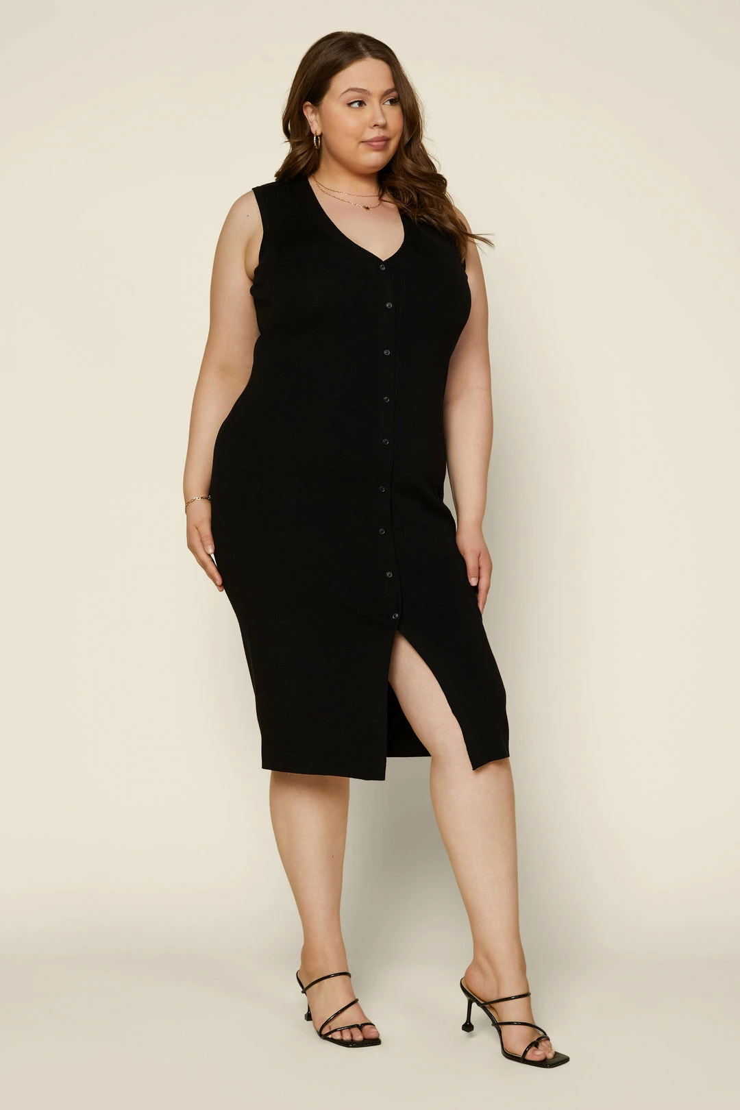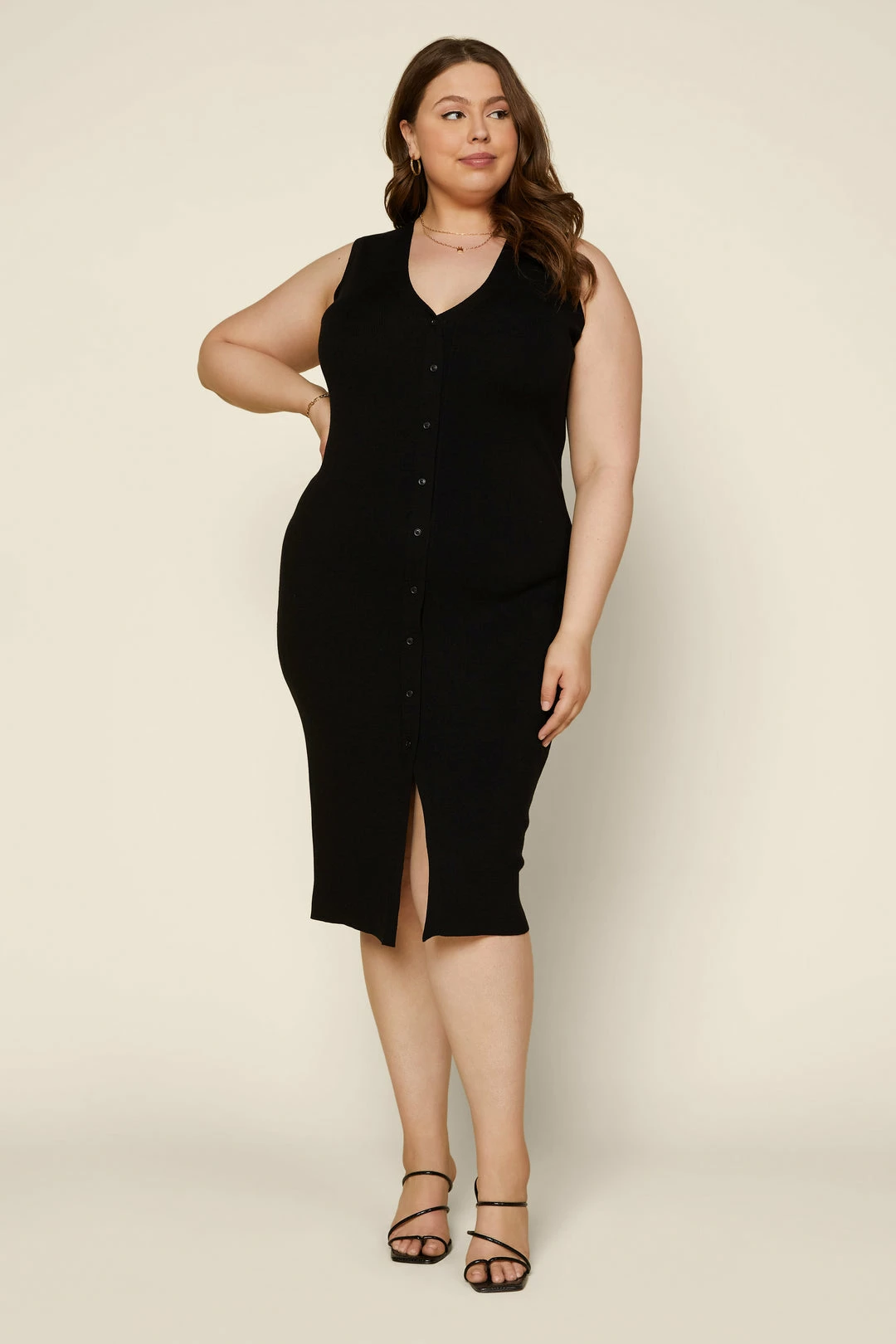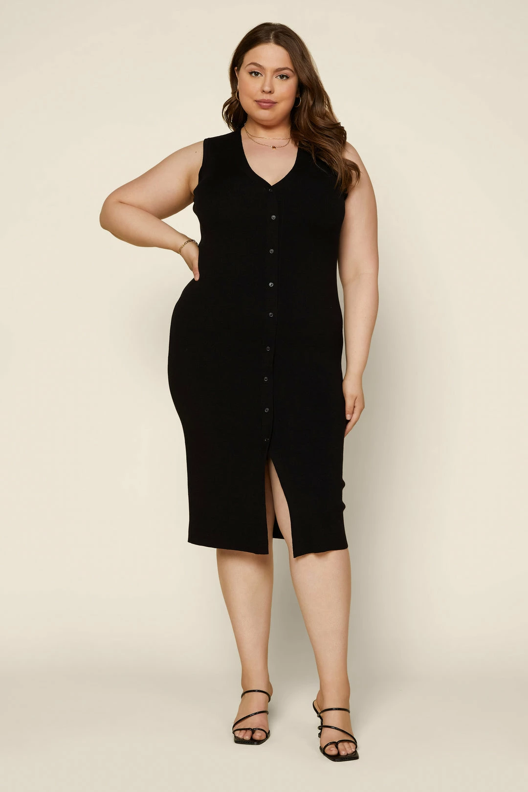 This sleeveless sweater dress flatters your curves in a comfy ribbed knit. Done here in a versatile neutral shade, it’s got buttons down the front so you can personalize the fit just the way you like.