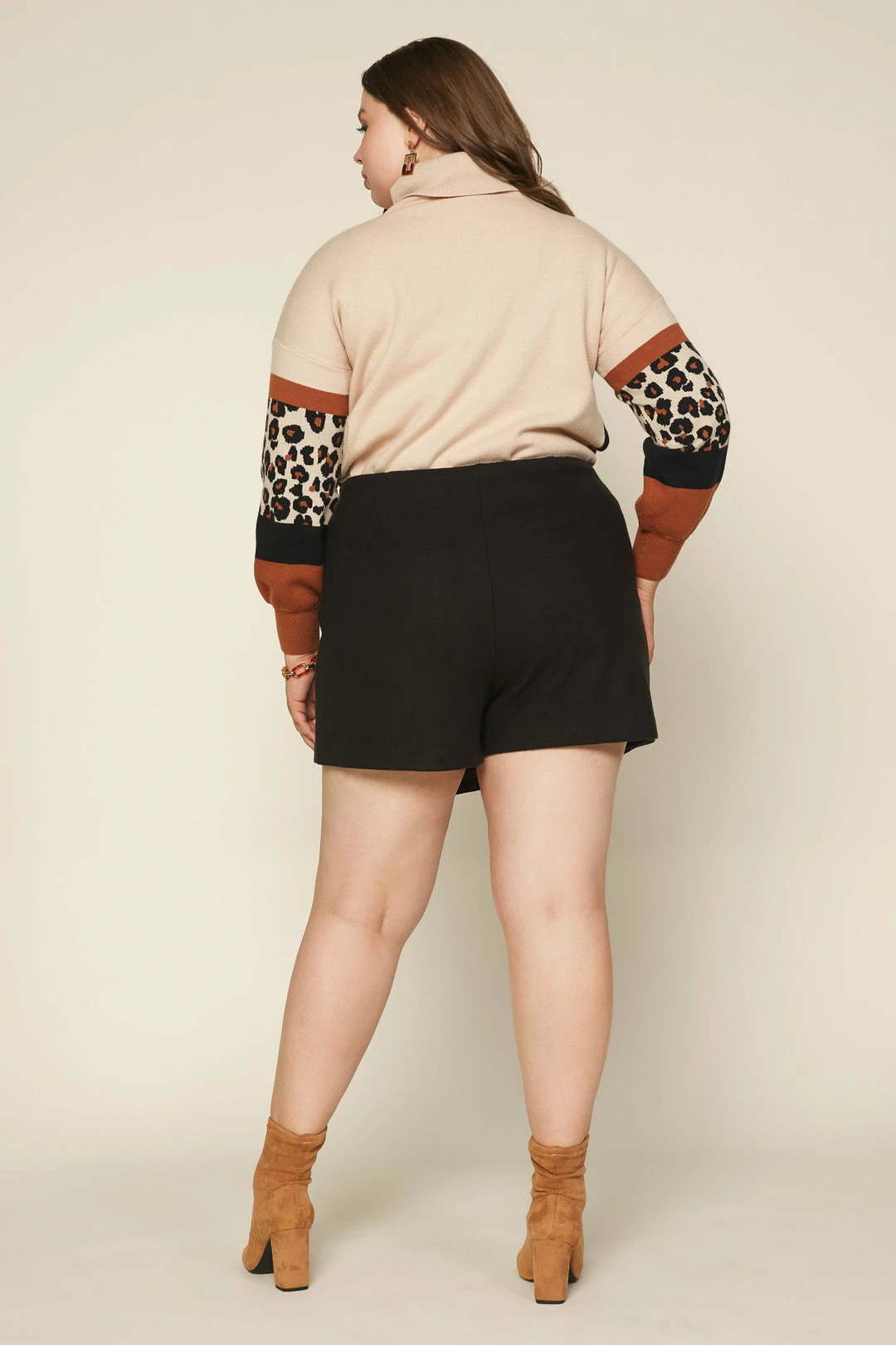 Sitting high on the waist, this wraparound skort is simple and chic with the look of a mod mini skirt. Wear it with a tee or sweater, or go for a statement by adding our split-sleeve cape coat.