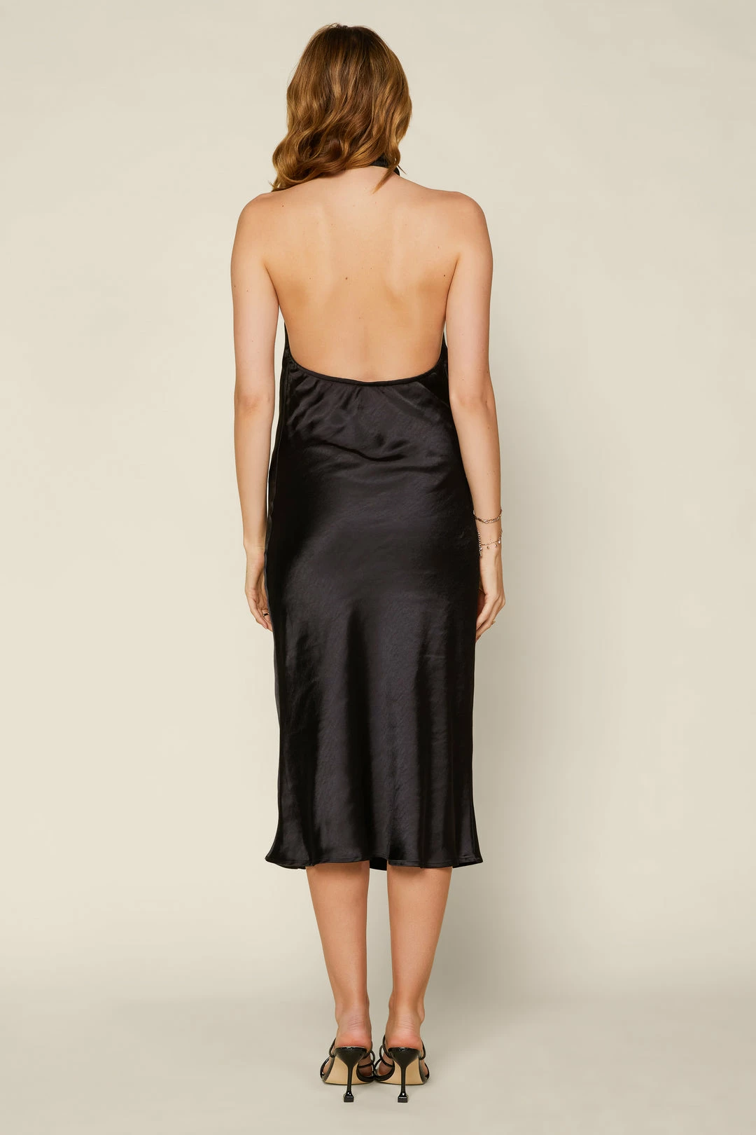 This satin midi dress has a femenine halter neckline with a keyhole opening, completed with a revealing open back.