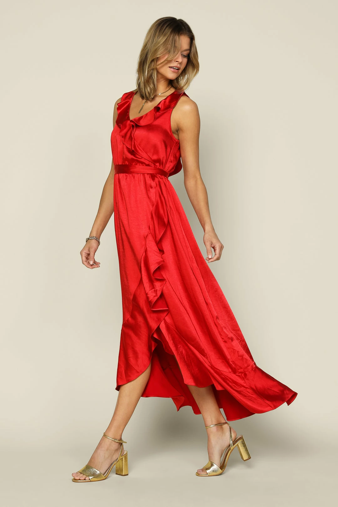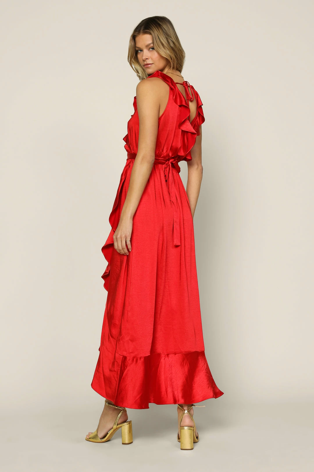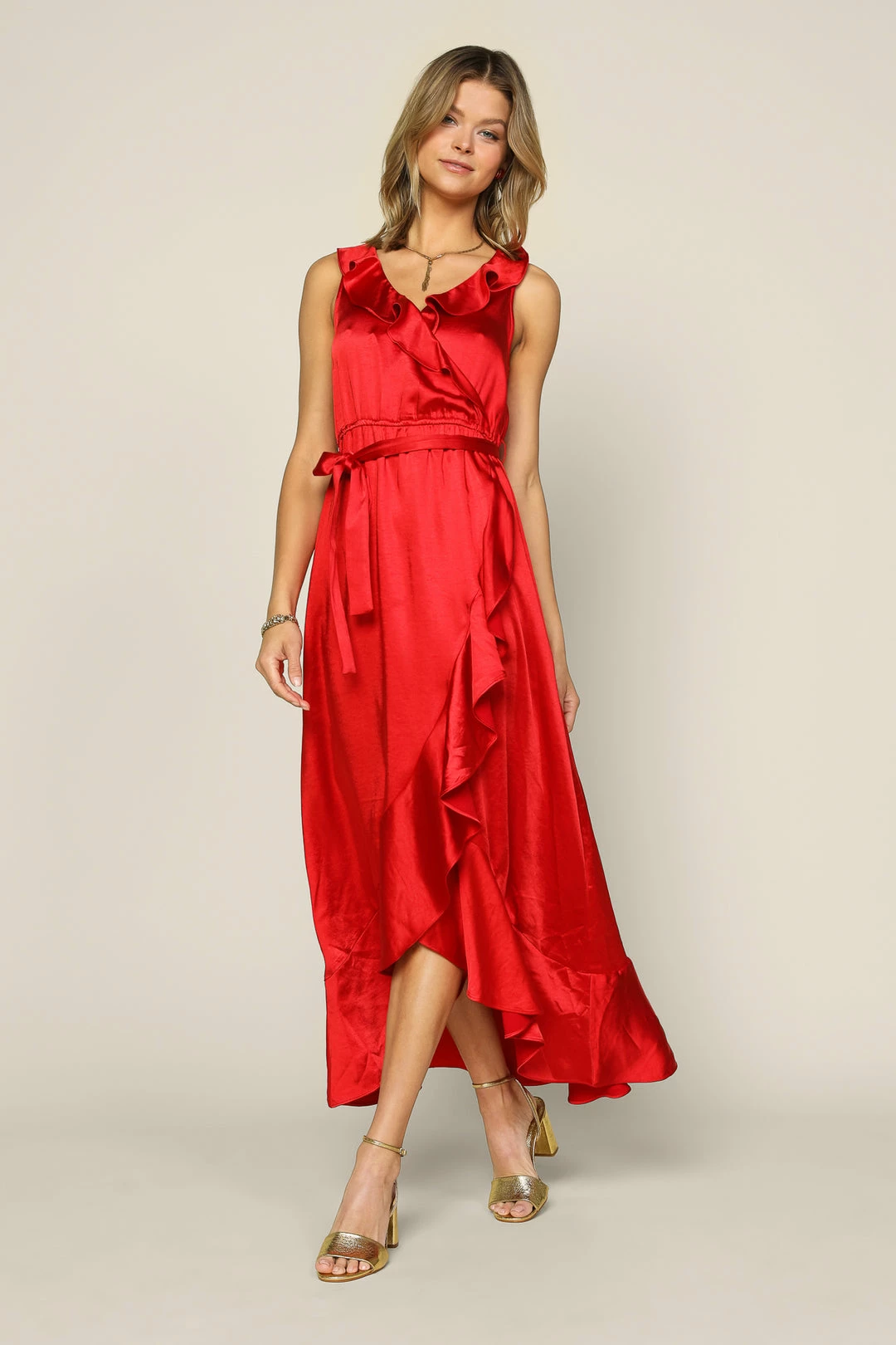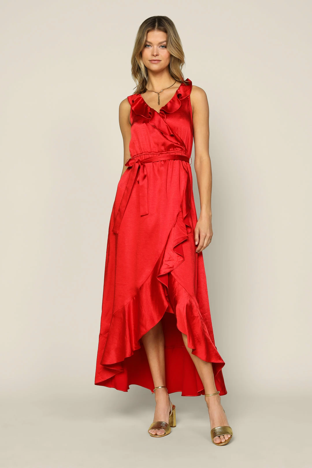 Ruffle trim dances along the edges of this surplice-style maxi dress with delicate tie detailing at the back. It’s sleeveless and flowy, cinched at the waist before falling to a tulip hem. Easygoing elegance for the season’s most special occasions.Â