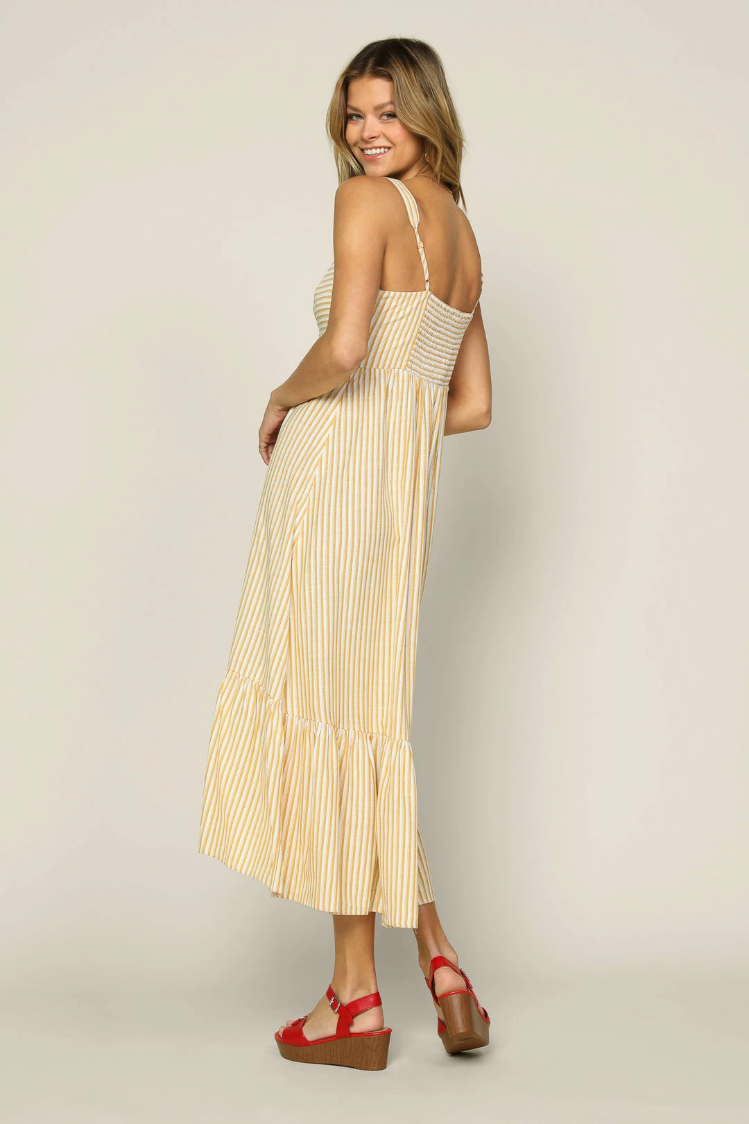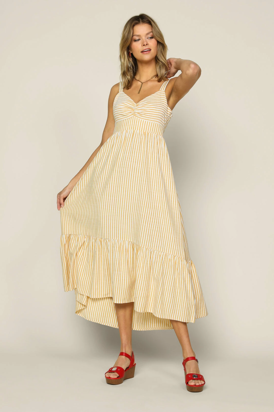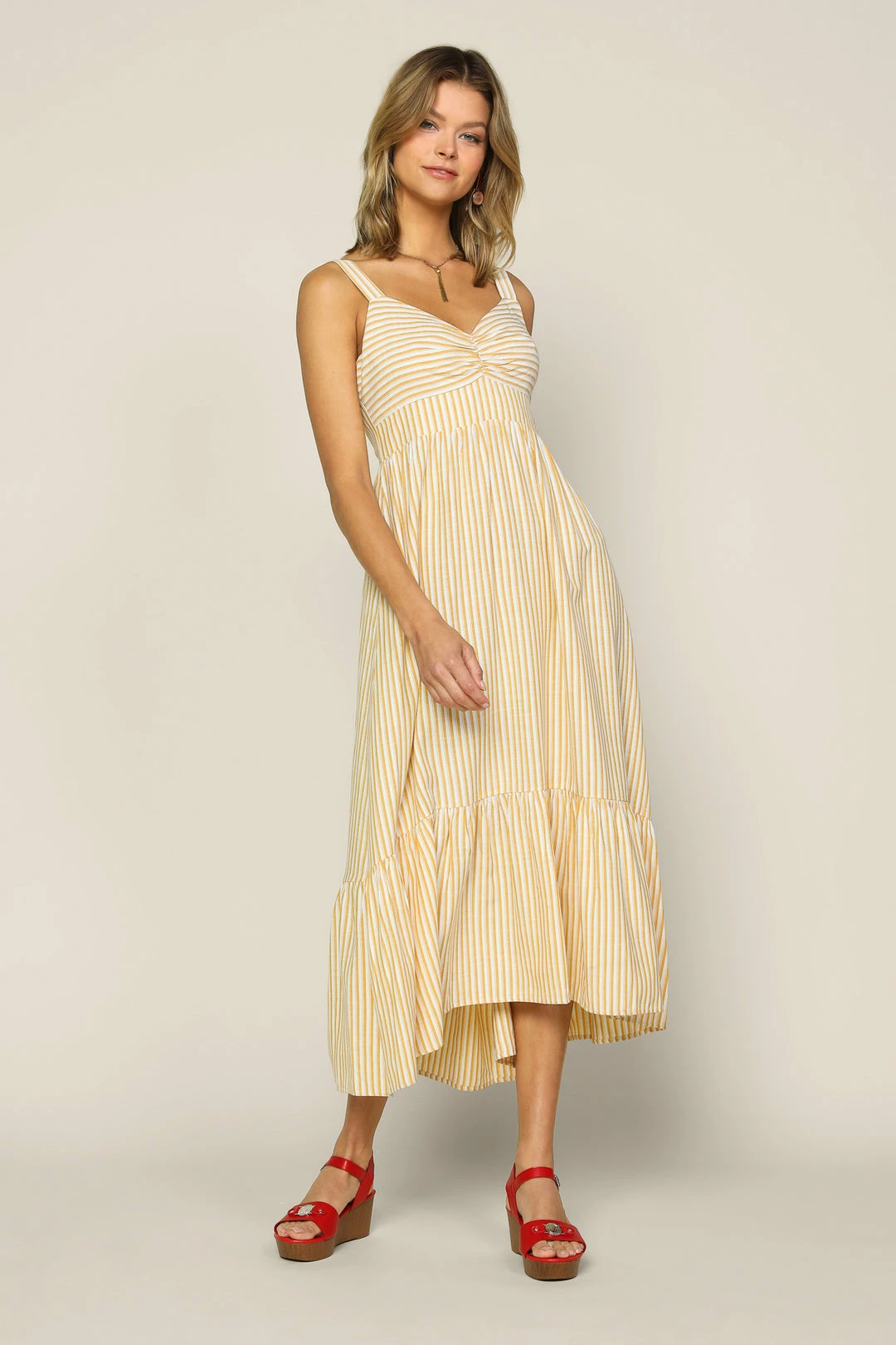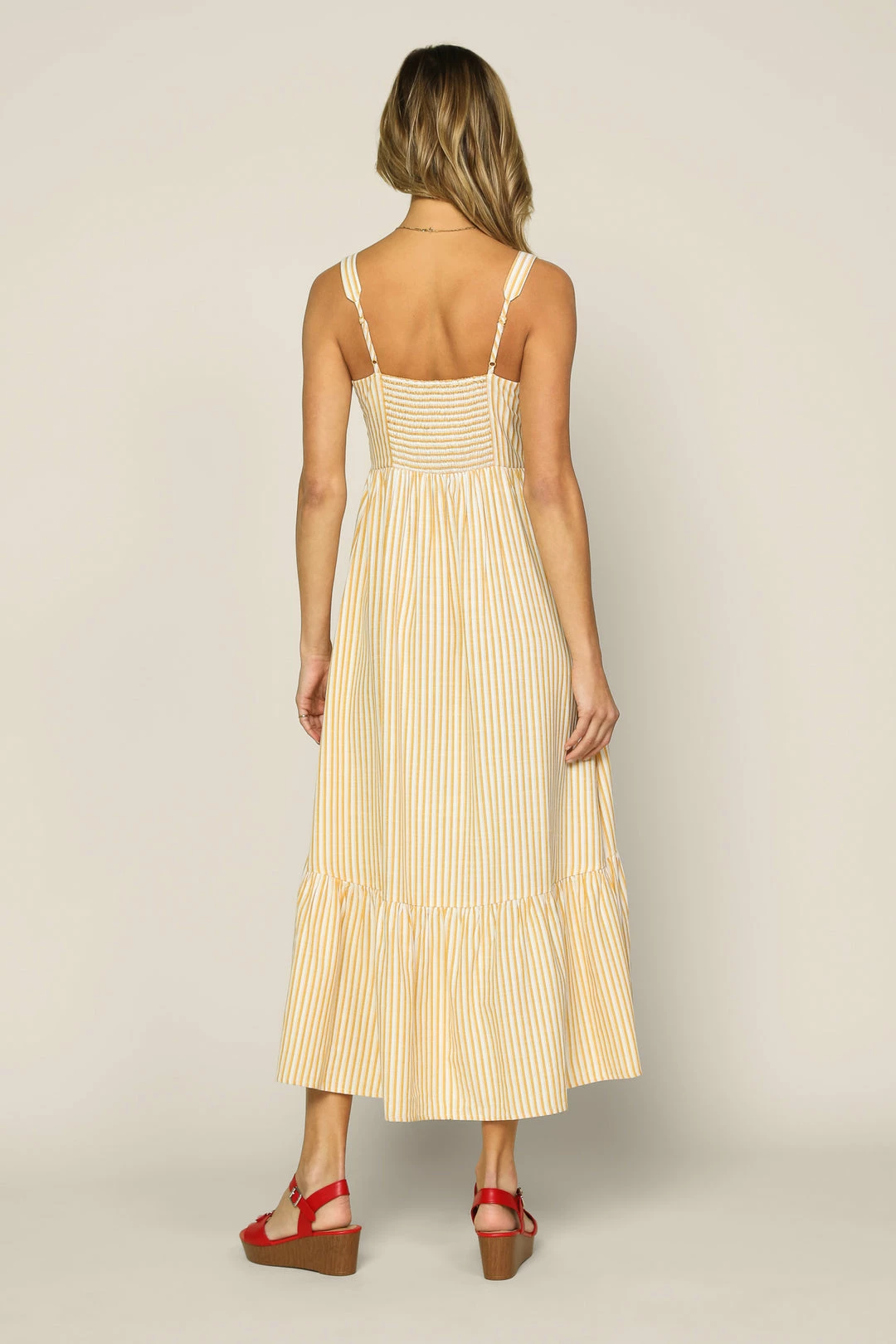 Sunny stripes pattern this tiered maxi dress, giving it a casual vibe. It’s got a fitted bodice with a sweetheart neckline, adjustable shoulder straps, and a smocked back, plus a flowing, ruffled hem.