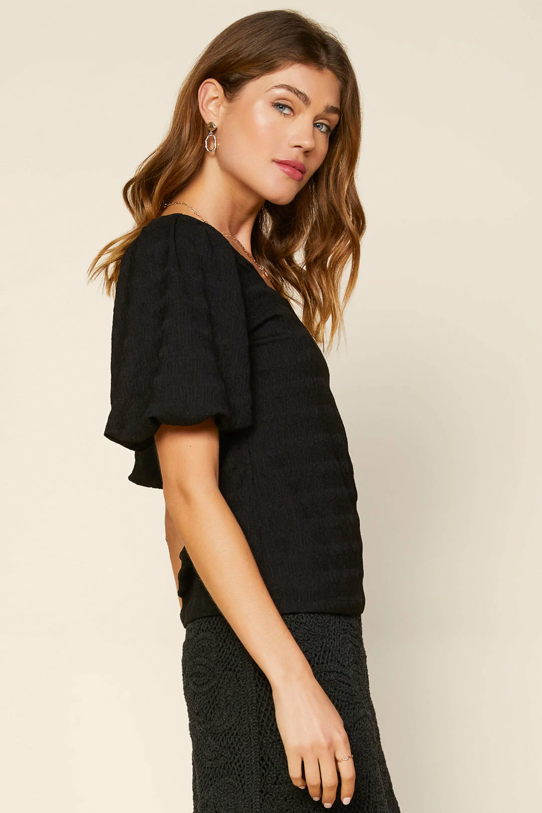 Crafted from a textured stripe knit, this square-neck top is all sorts of pretty thanks to its voluminous bubble sleeves. Wear it in place of your everyday tee, or dress it up for going out.