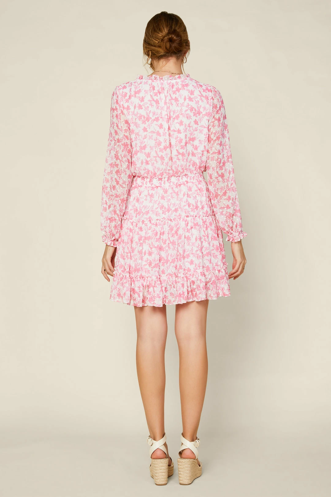 Get ready to bloom in this ruffled mini dress made from airy jacquard with a refreshing blue-and-white floral print. The swingy style has a split neckline, tie detailing accented by gold-tone metal tipping, and a swishy hem that’s made to move.