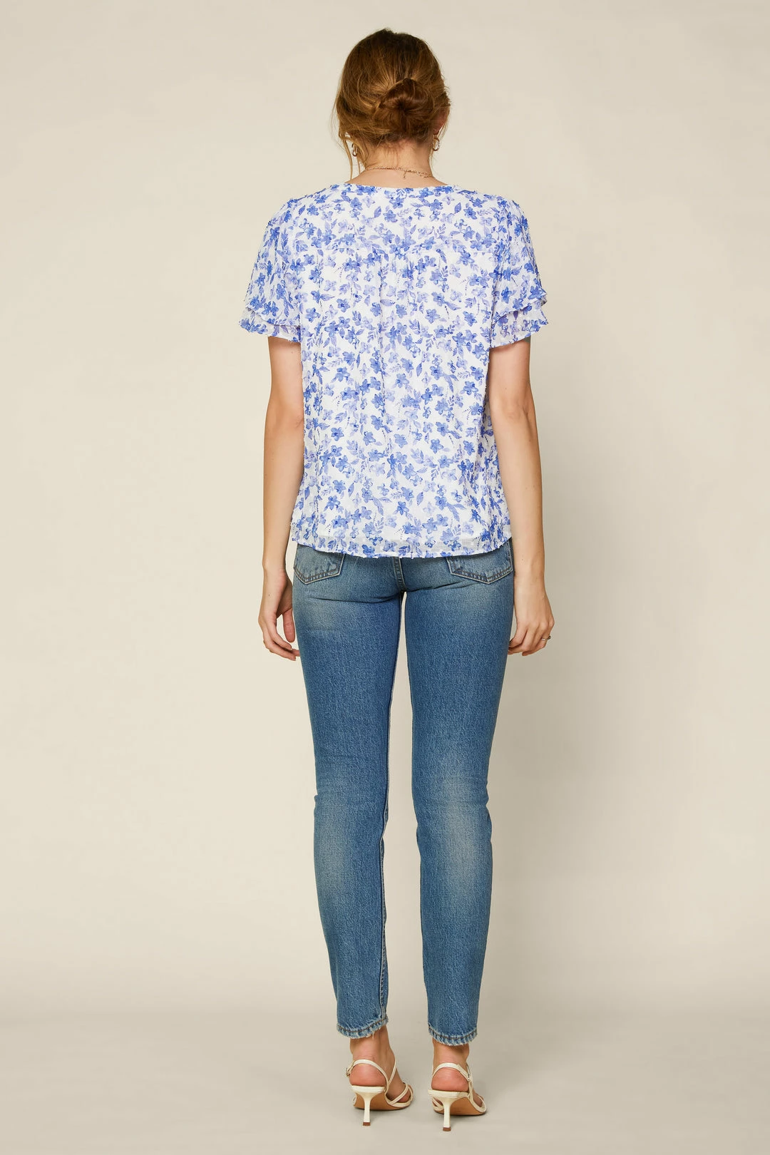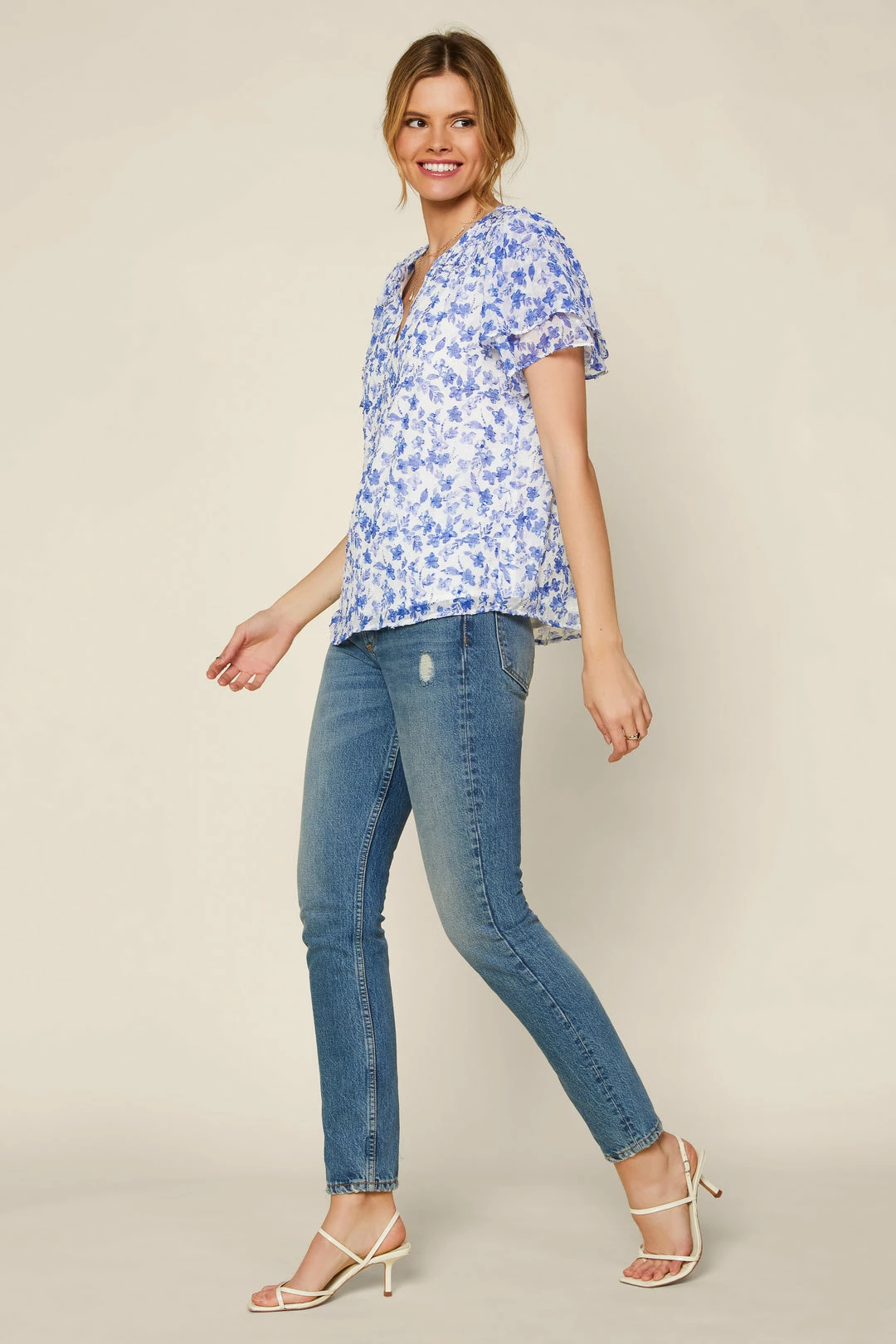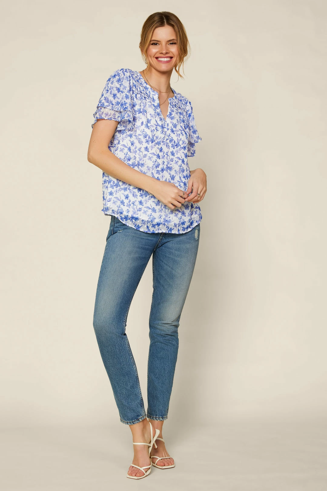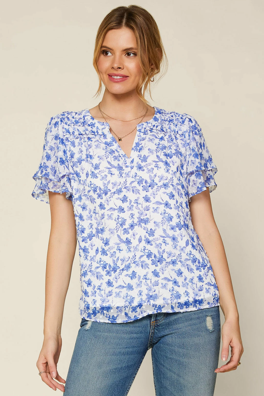 This floral-print top is your new go-to for warm-weather outfitting. Subtly textured jacquard gives it a light and airy feel. Ruffle trim finishes the look.