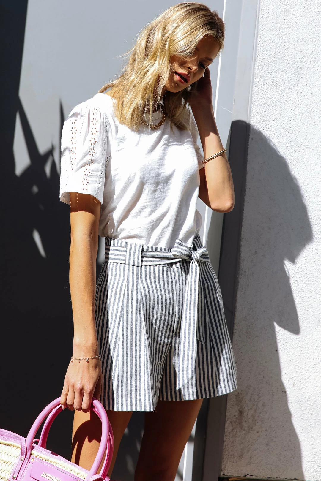 A stylish pair of shorts is a perennial favorite for the warm-weather wardrobe. This yarn-dyed striped pair will get plenty of play this season, designed with a high waist, pleating at the front, and an adjustable tie belt.